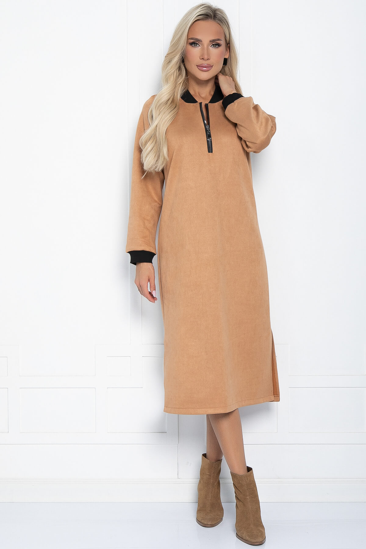 Стильное платье прямого силуэта невероятно приятое на ощупь. Рукав реглан оканчивается притачной манжетой. Воротник выполнен из эластичной трикотажной резинки - кашкорсе. По переду застёгивается на молнию. Низ ровный по бокам разрезы. При помощи пояса, входящего в комплект, можно подчеркнуть талию.