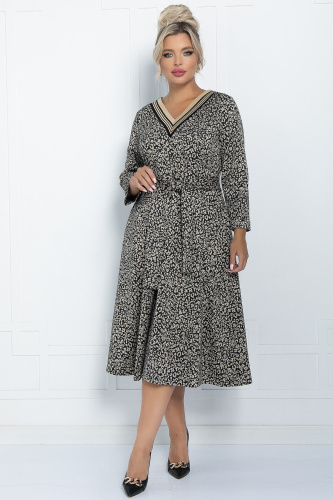 Женственное трикотажное платье приталенного силуэта с расклешённой юбкой подчеркнёт вашу красоту. Оно будет отлично смотреться с туфлями на каблуке. Пояс из основной ткани входит в комплект. Платье отрезное по талии.