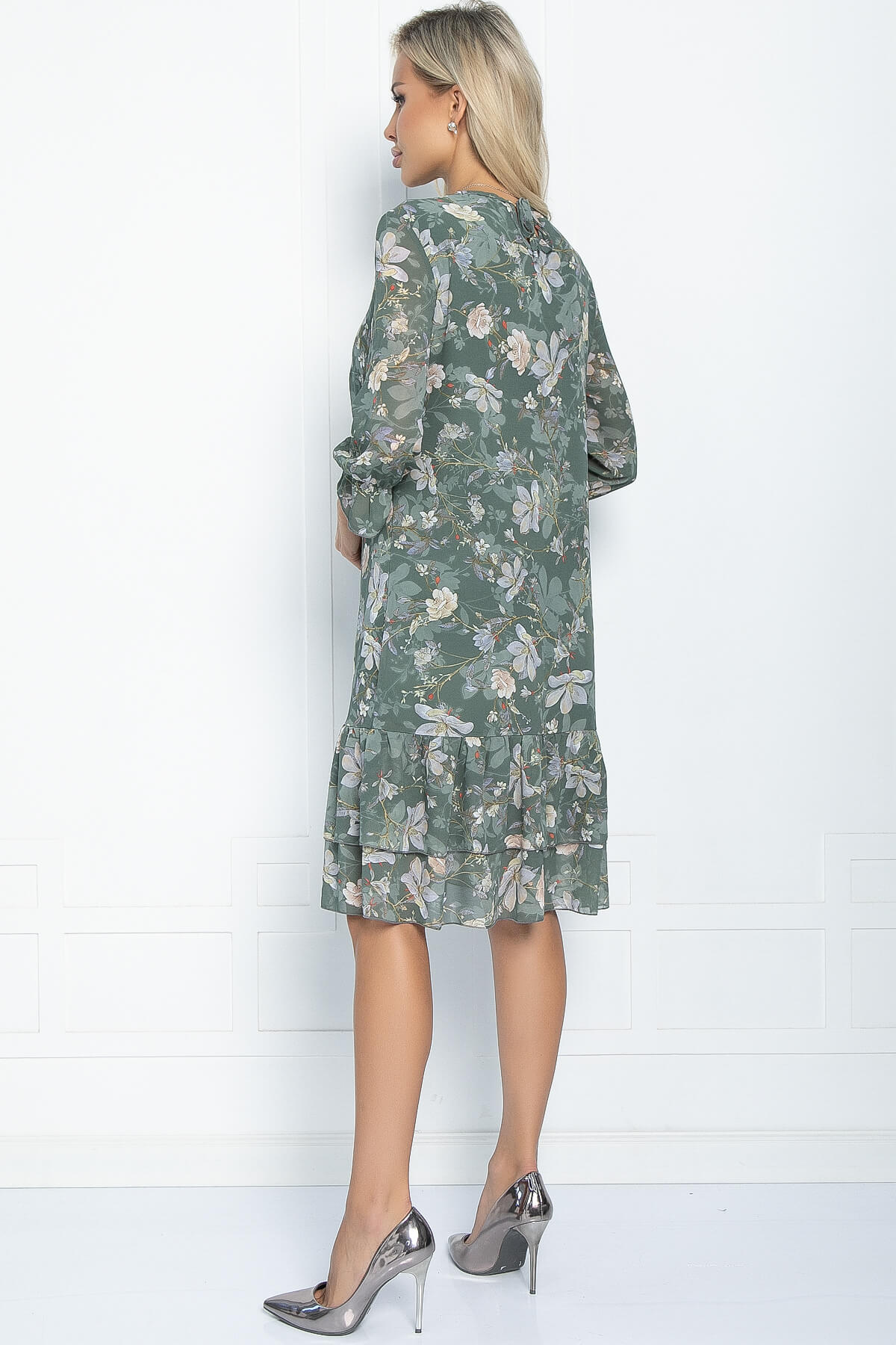 Платье прямого кроя из шифона - изящное и практичное решение для любого случая. Оно отлично подходит для официальных мероприятий, вечерних прогулок или романтических свиданий. Низ платья украшен двойным воланом, который придает изысканность образу. Горловина платья округлая, с окантовкой. Рукава втачные 3/4, на резинке. Завязывается на завязках на спинке.
