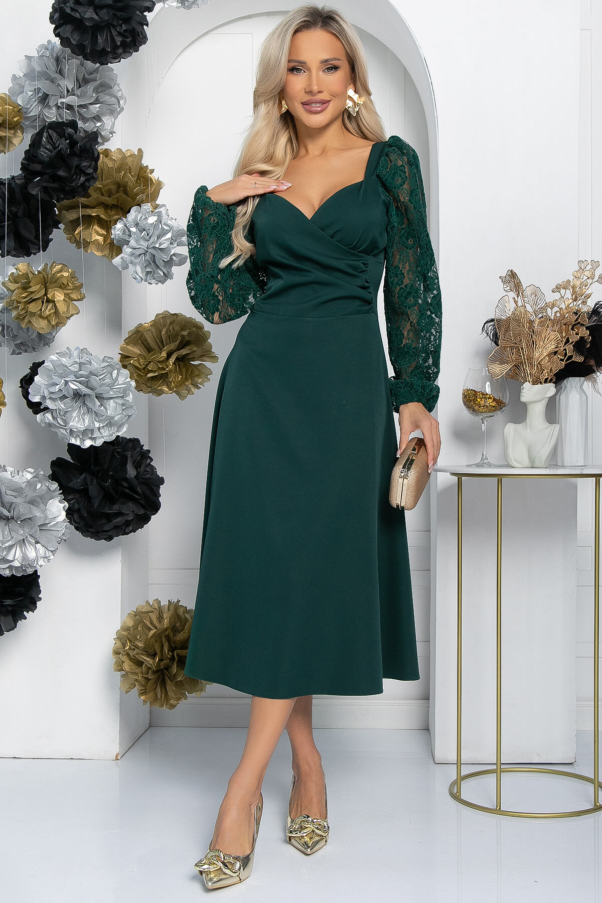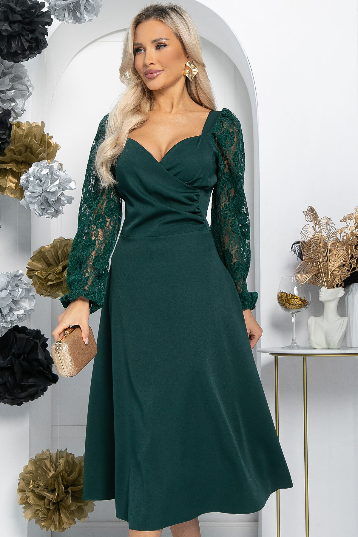 Невероятно женственное платье с воздушными рукавами позволит создать утончённый вечерний образ. Приталенный силуэт, красивый, скроенный на запах вырез, подчеркнут изящность линий женской фигуры. По переду выполнена драпировка, позволяющая замаскировать небольшие недостатки проблемных зон и визуально уменьшить область талии.