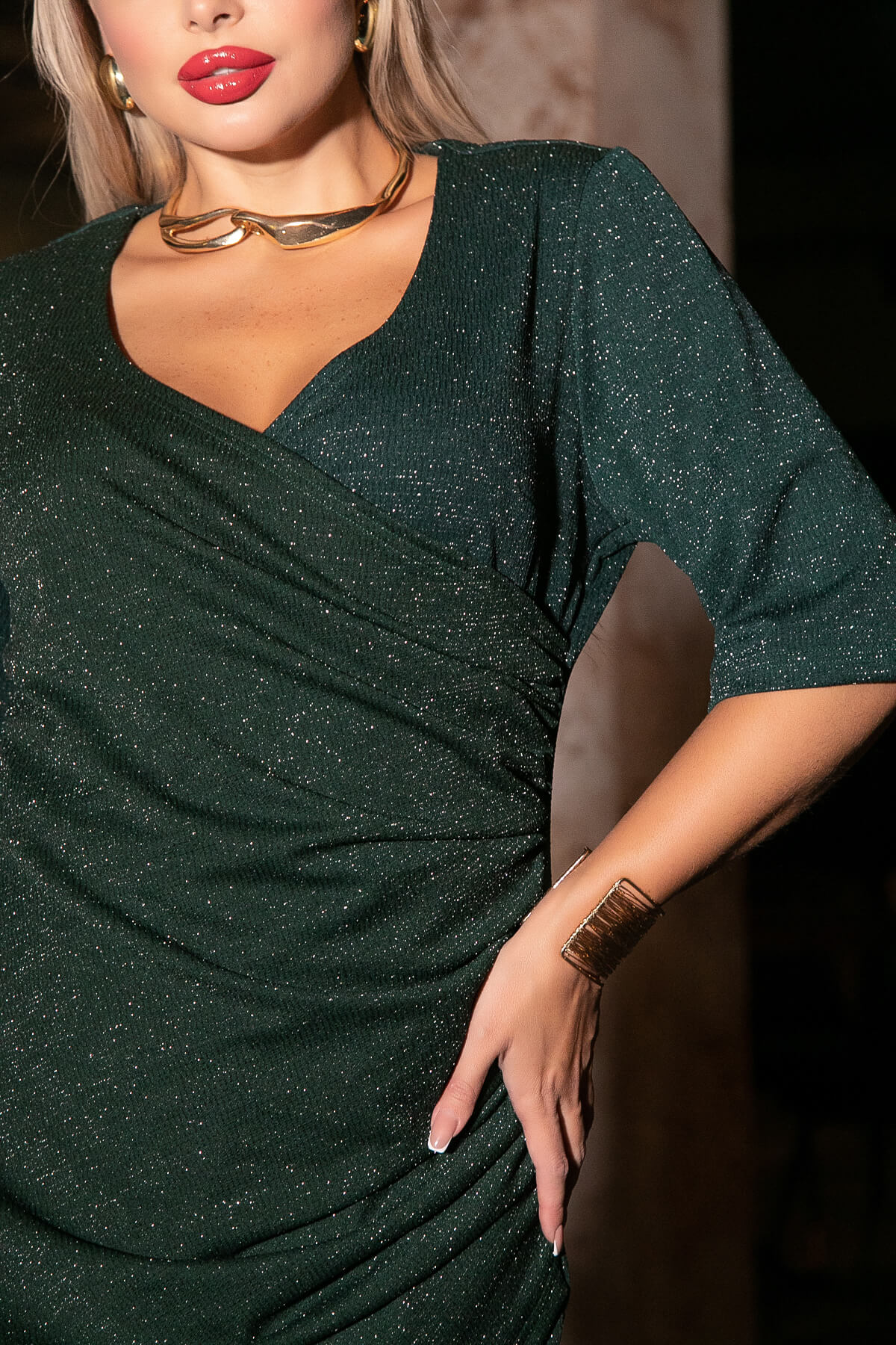 Вечернее платье прилегающего силуэта в мерцающем изумрудном оттенке. Эффектное платье с V-образным вырезом. Перед скроен по принципу платья с запахом со сборкой в области талии. По низу изделие скруглено, что визуально удлиняет ножки. Шикарный вырез идеально подчеркивает зону декольте.