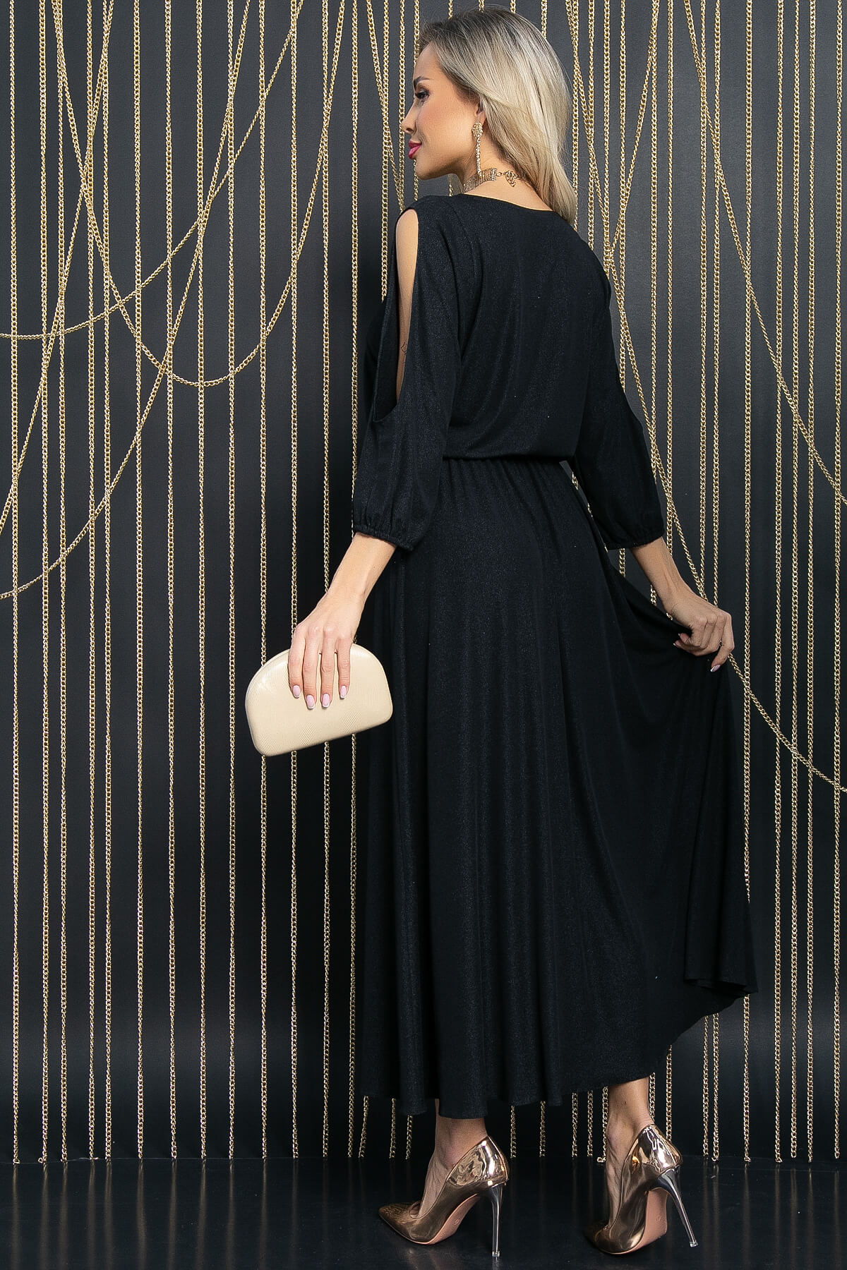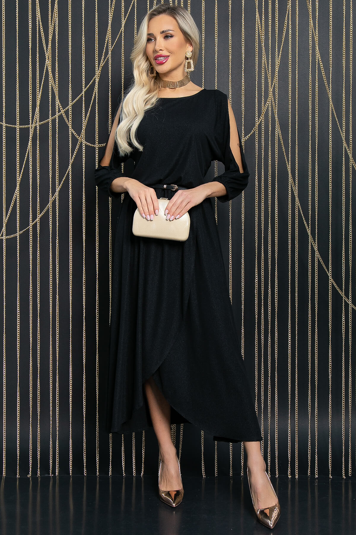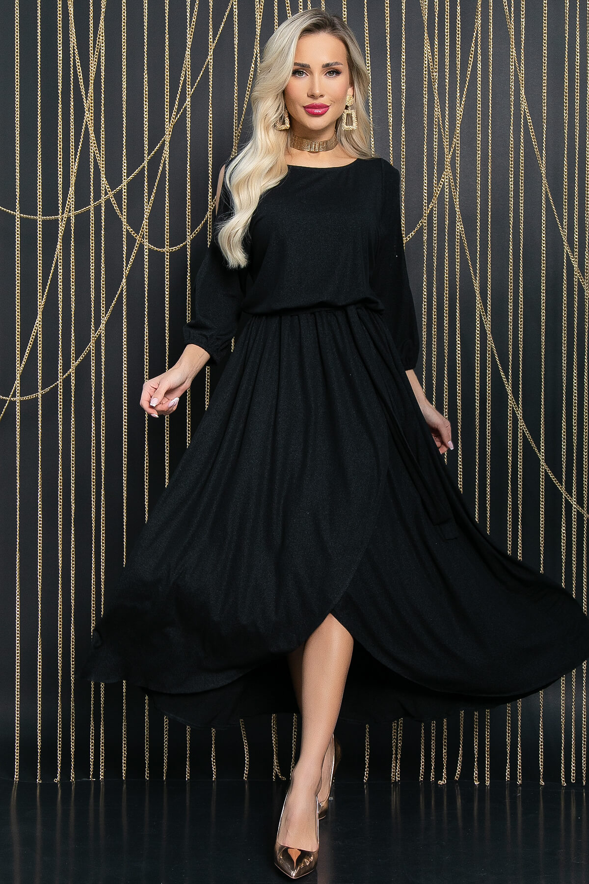 Шикарное макси-платье свободного силуэта с акцентными рукавами. Платье свободного силуэта, талия собрана на резинку и отделяет верх от юбки, скроенной на запах. Рукав втачной, три четверти с овальным вырезом. Горловина - лодочка. В комплекте пояс из основной ткани.