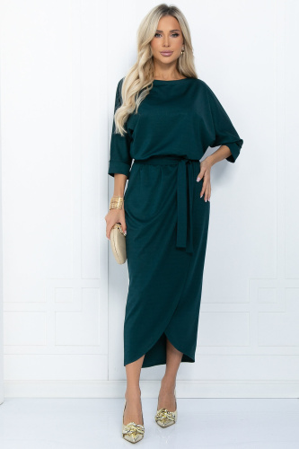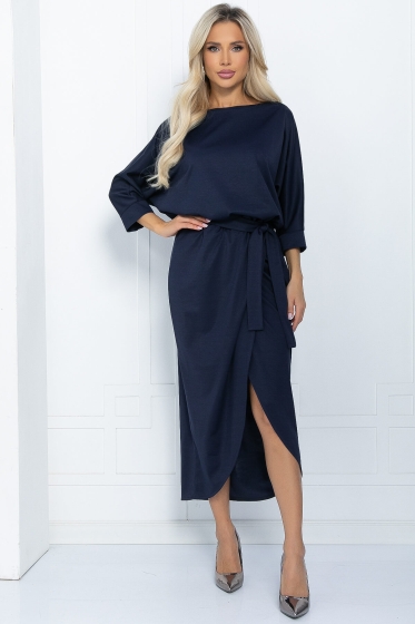 Прекрасное платье, которое подойдет как для повседневных образов, так и для особых мероприятий, благодаря своему универсальному и стильному дизайну. Верх платья скроен по типу «летучая мышь», что обеспечивает свободу движений. Юбка на запах в стиле тюльпан идеально подчеркивает фигуру, а резинка по талии добавляет дополнительный комфорт. В комплект входит пояс из основной ткани.