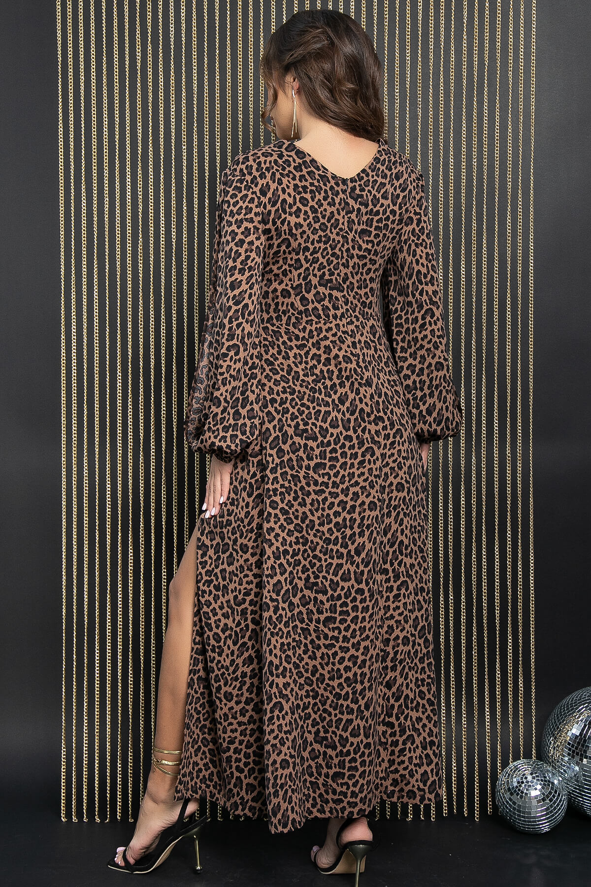 Элегантное платье с леопардовым принтом, длиной макси, имеет высокий разрез, который смело открывает ногу, придавая образу нотку смелости и сексуальности. V-образный вырез горловины и длинные втачные рукава на резинке добавляют образу изысканности.