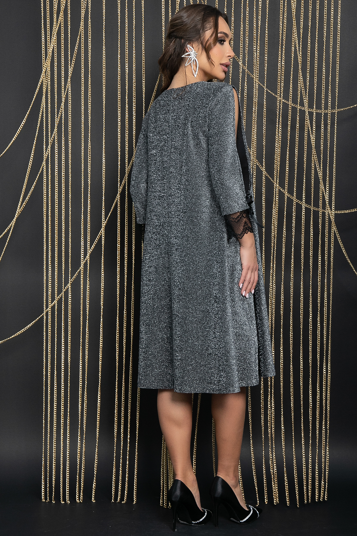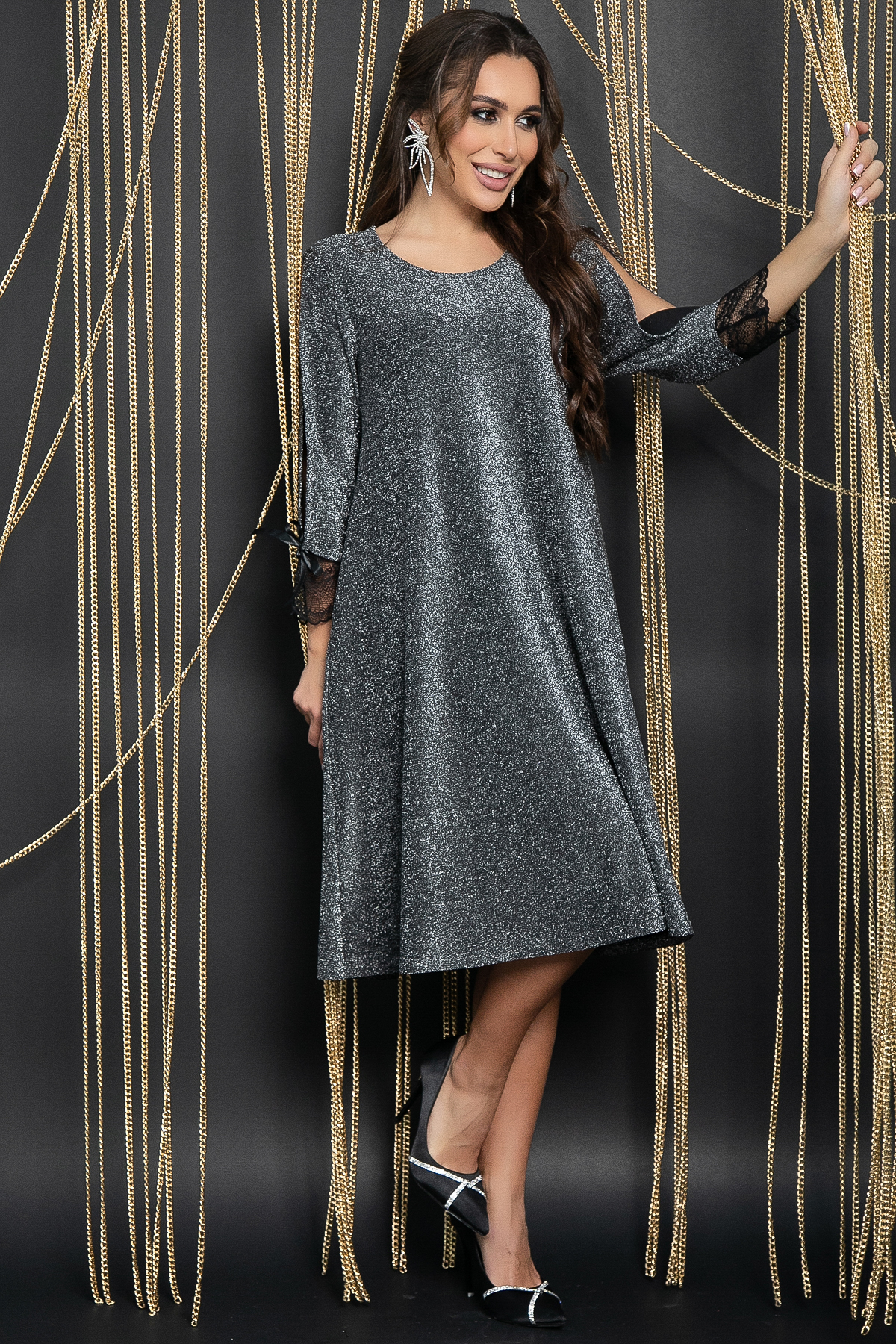 Платье, искрящееся, как Ваше настроение в Новогоднюю ночь! А-силуэт позволит Вам чувствовать себя максимально комфортно, ведь он не облегает фигуру, что является преимуществом в череде праздничных событий. Главной особенностью платья является его рукав три четверти с разрезом. Украшен атласными лентами, которые можно завязать, и кружевом по нижнему краю, что придаёт ему изысканный вид.
