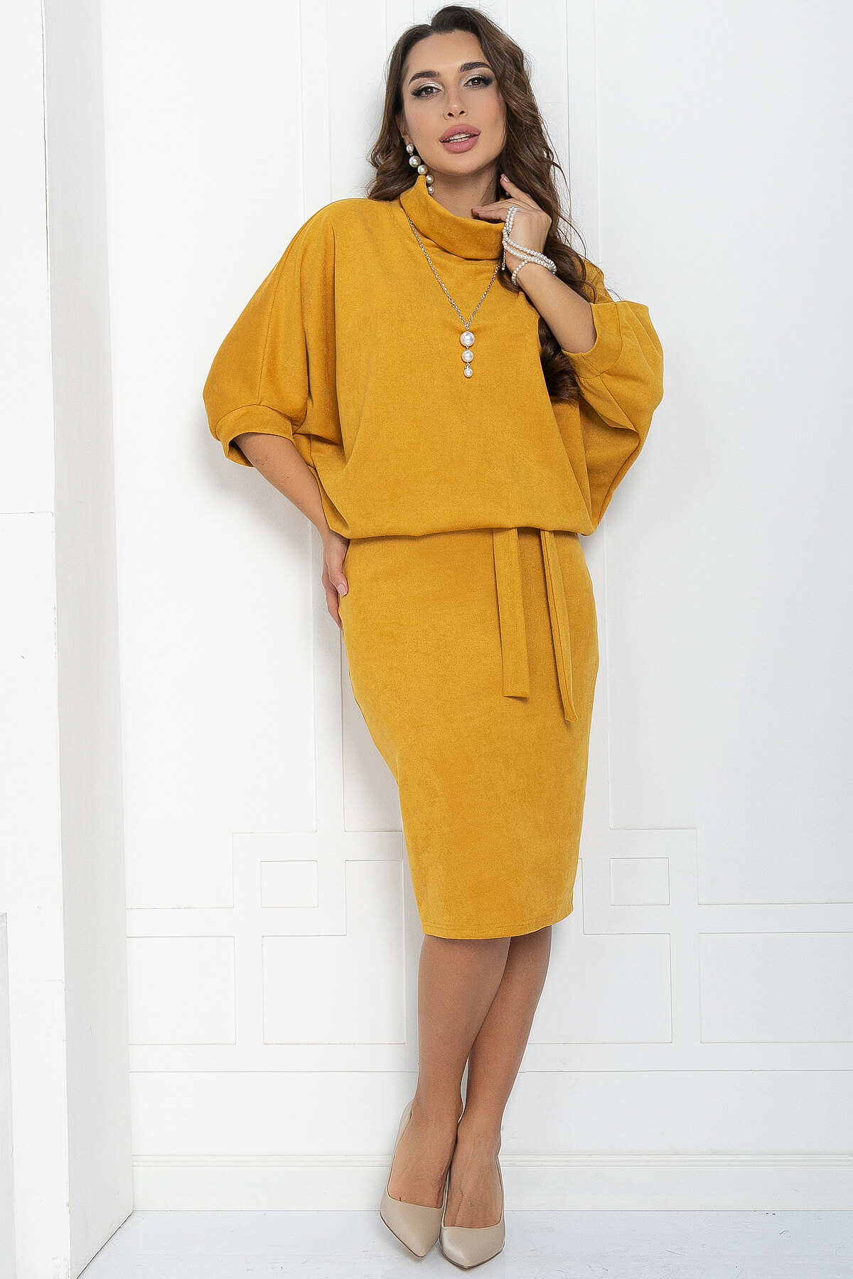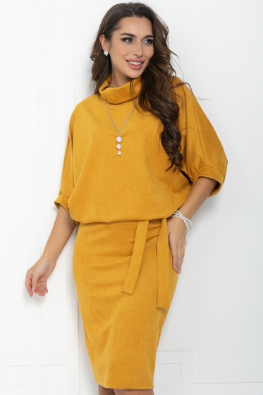Платье из плотного трикотажа в красивом горчичном оттенке. Элегантная юбка, прилегающего силуэта, подчеркнёт красоту женской фигуры и визуально вытянет силуэт, а свободный верх не будет сковывать движений. Платье прекрасно подойдёт в качестве повседневного варианта и будет хорошо сочетаться как с туфлями или ботильонами, так и с кроссовками или ботинками. Благодаря своему фасону платье прекрасно справляется с задачей скрыть небольшие недостатки фигуры и подчеркнуть достоинства. Пояс из основной ткани и украшение входят в комплект.