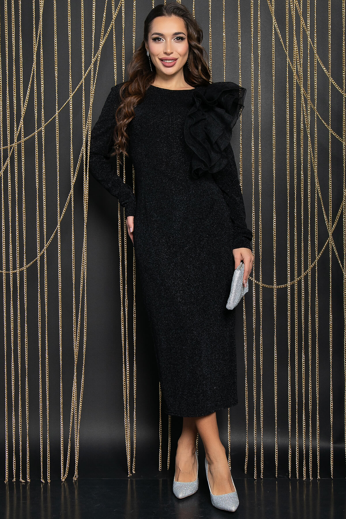 Эффектное платье из плотного трикотажа с люрексом — великолепный выбор для торжественных случаев! Его уникальный дизайн привлекает внимание: спереди — округлый вырез, а сзади — углубленный V-образный. От плеча до талии спереди и по спинке платья украшает изящный волан, придающий ему особое очарование. Сзади разрез.