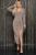 Эффектное платье в золотом оттенке станет отличным выбором как для вечерних выходов, так и для важных событий! Чтобы создать завершённый образ, дополните его аксессуарами и обувью на каблуке. Особенностью этой модели является разрез по переду, который придаст вашему образу изящество и сексуальность. Горловина V-образной формы украшает как переднюю, так и заднюю часть платья. Молния располагается на спине. Рукав втачной.