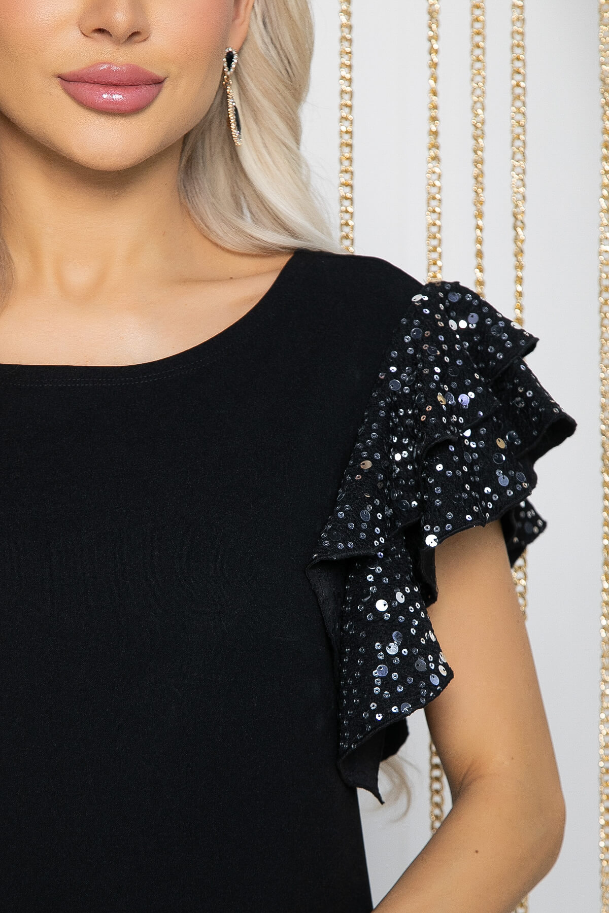 Изящное платье-трапеция, выполненное из трикотажной ткани, удобное и комфортное. За счет простого кроя платье прекрасно подходит на любой тип фигуры, подчеркнет достоинства и скроет все несовершенства. Лёгкость и нарядность платью придаёт рукав-крылышко, выполненный из ткани с пайетками.