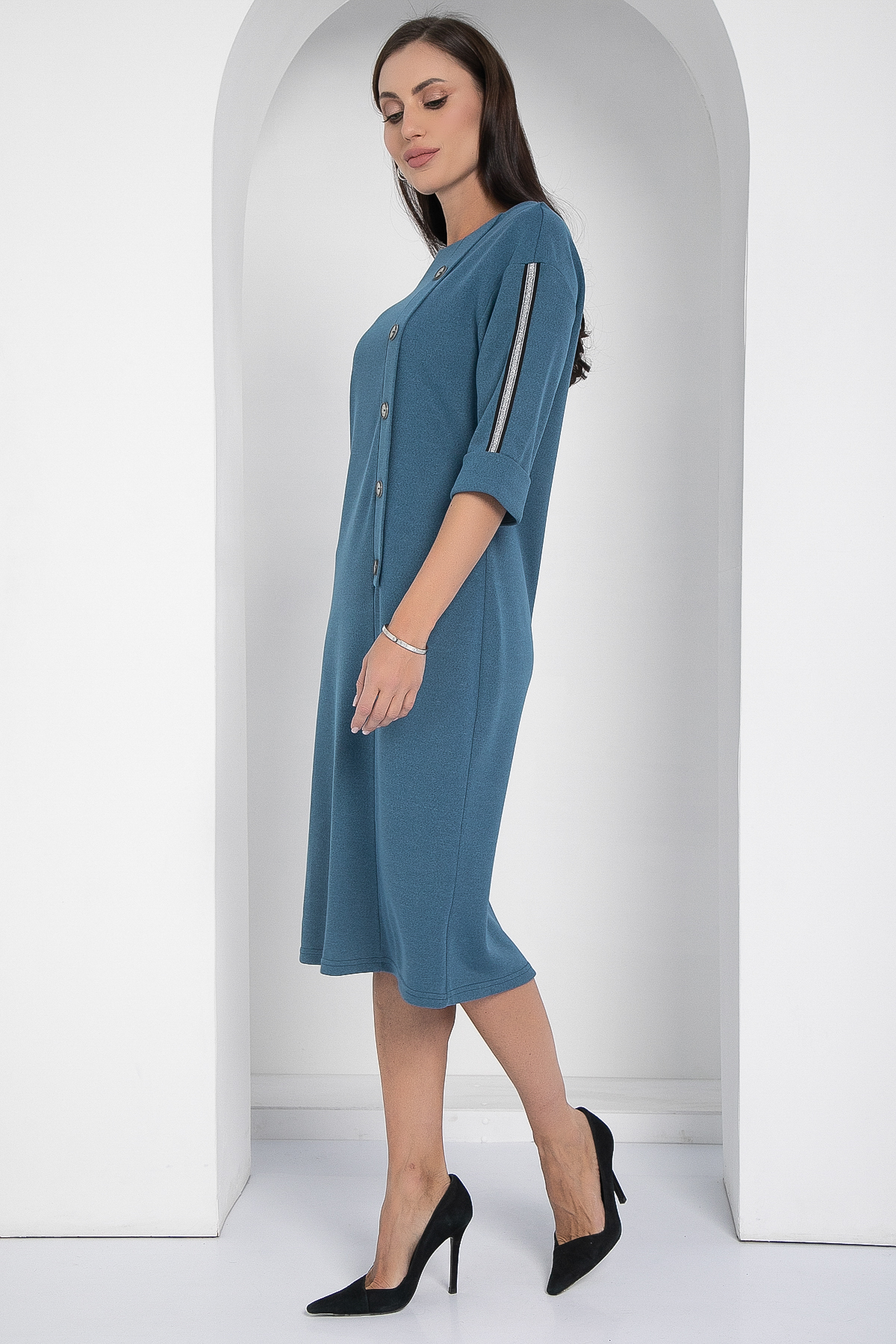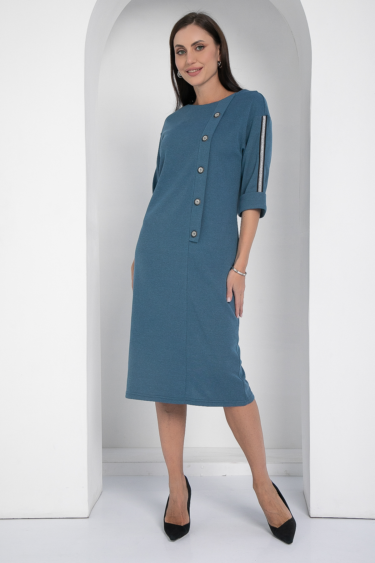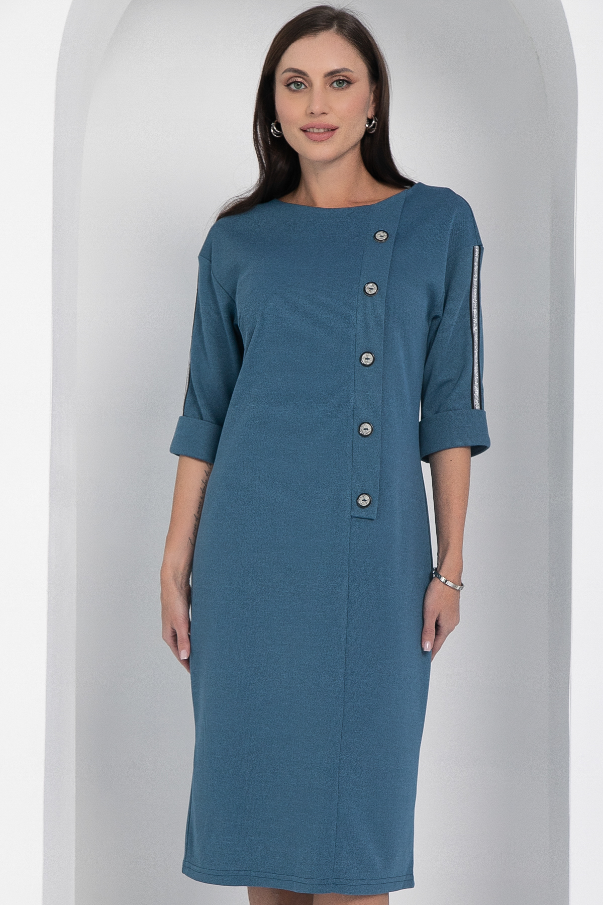 Трикотажное платье в спортивном стиле с акцентными лампасами на рукавах. Платье подарит вам удобство, стиль, комфорт и практичность. К такому женскому платью можно подобрать любую обувь: от туфель до кроссовок. Универсальный вариант для жизни: работы и отдыха. Втачной рукав со спущенной линией плеча.