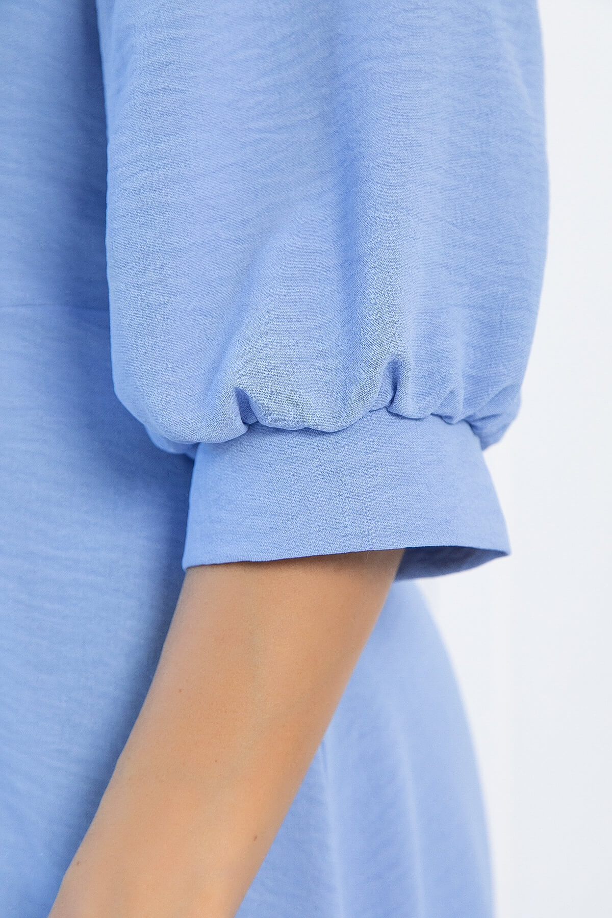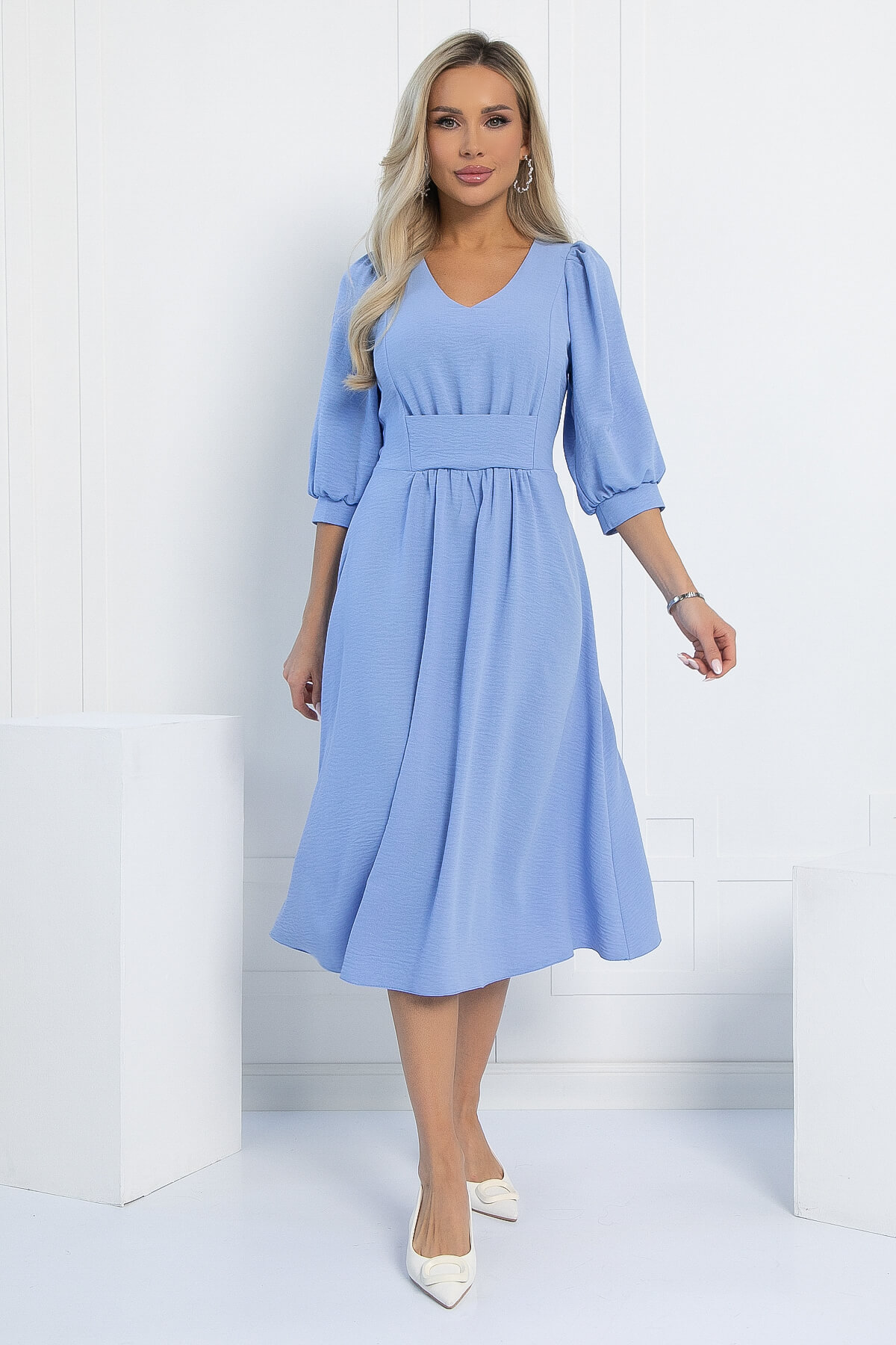 Платье средней длины с приталенным силуэтом станет настоящим украшением вашего гардероба! Благодаря отрезной линии талии оно подчёркивает фигуру, а расклешенная юбка придаёт образу лёгкость и женственность. Рукав-реглан средней длины на сборке завершается изящным манжетом, что делает платье ещё более утончённым. V-образная горловина добавляет в образ нотку изящества. Спереди платье украшено декоративным элементом в виде сборки, которую аккуратно закрывает втачной пояс. Сзади пояс аналогичный и собран на широкую резинку.