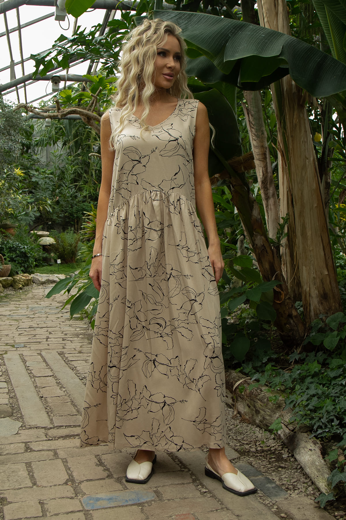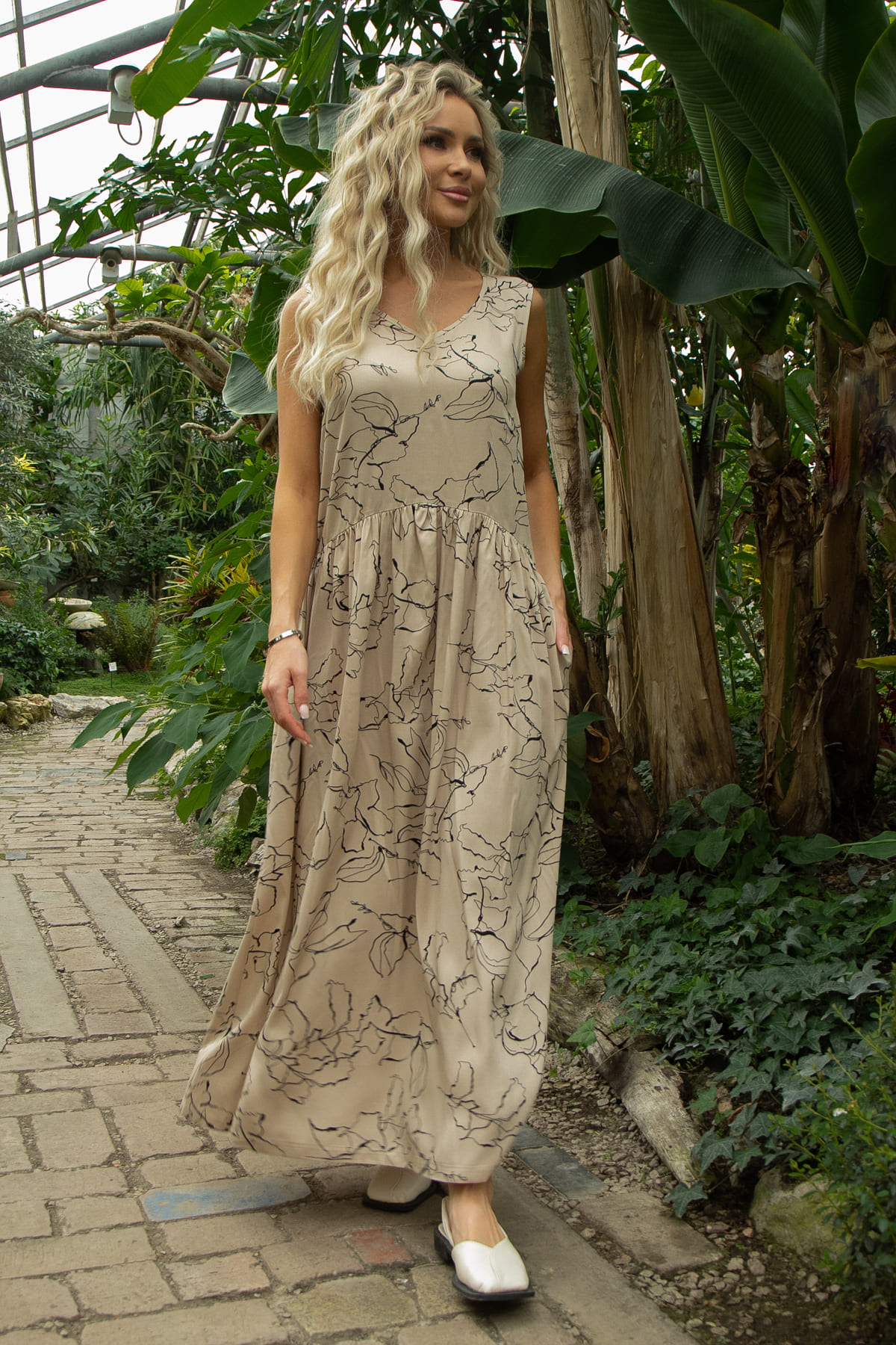 Платье свободного силуэта без рукавов идеально для теплых дней. Легкое и натуральное, оно гармонично сочетается как с каблуками, так и с кедами. Удобные боковые карманы позволяют носить с собой мелочи. Юбка собрана в драпировку, что даёт свободу в бёдрах и движении. Завершает образ V-образный вырез горловины.