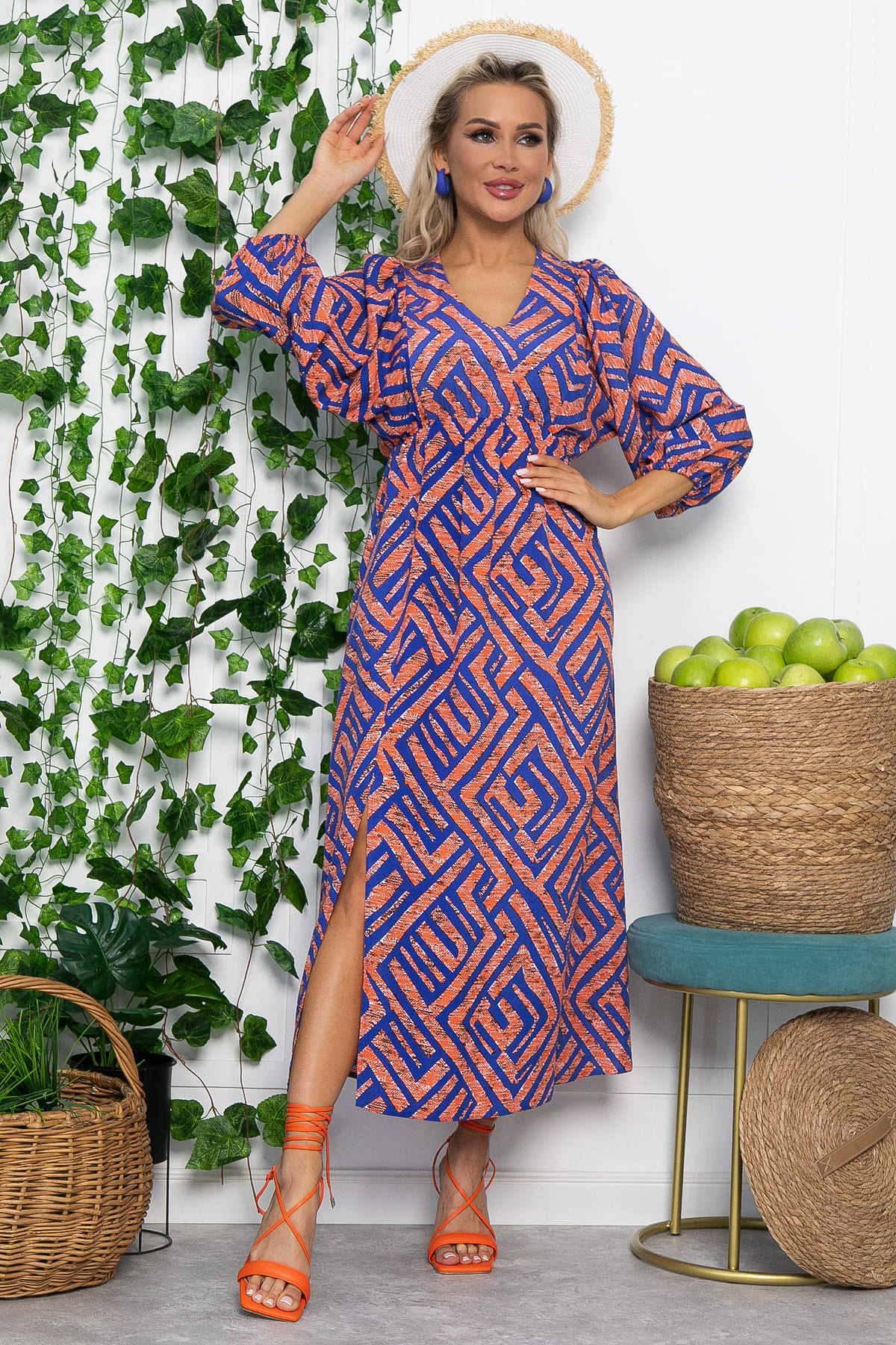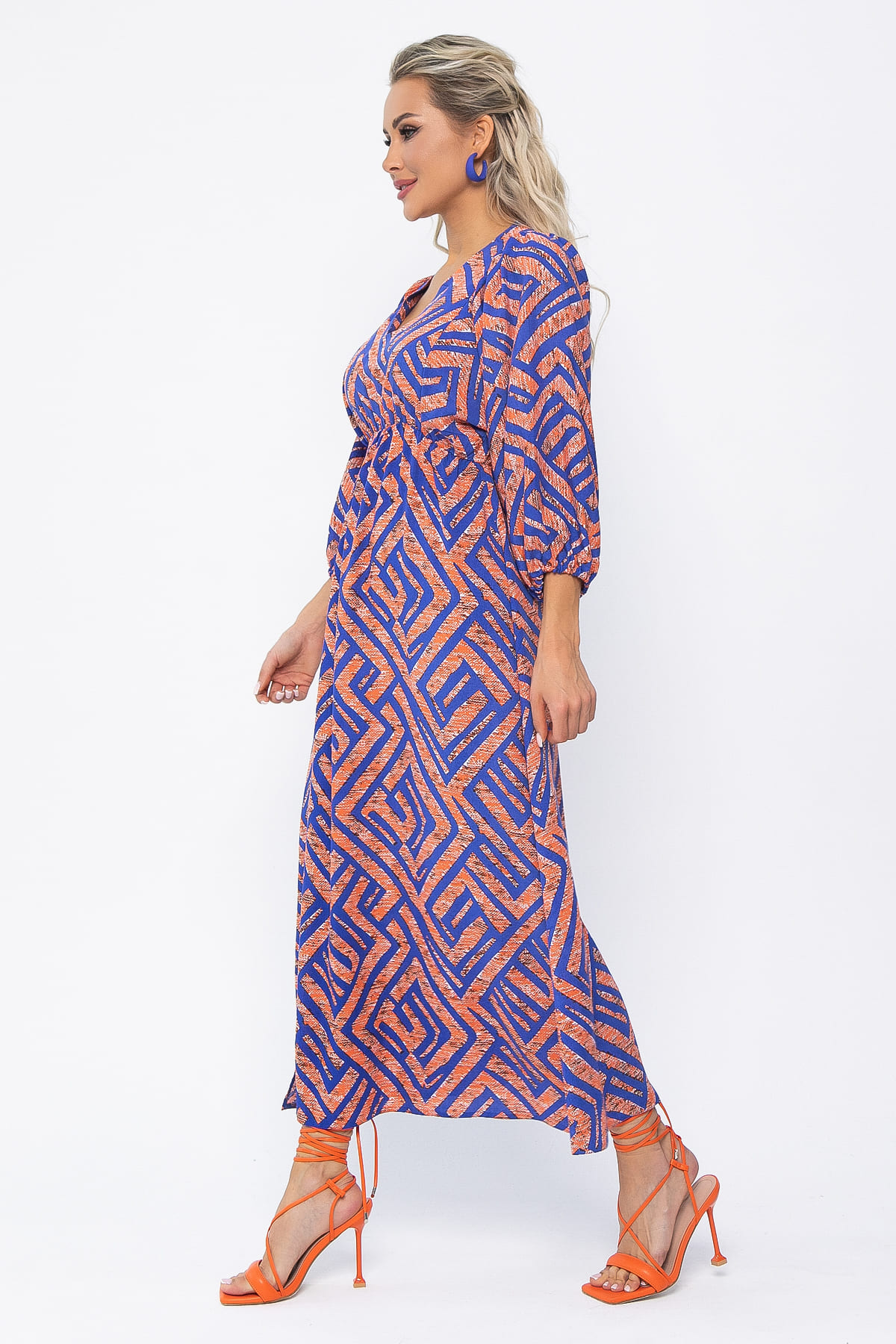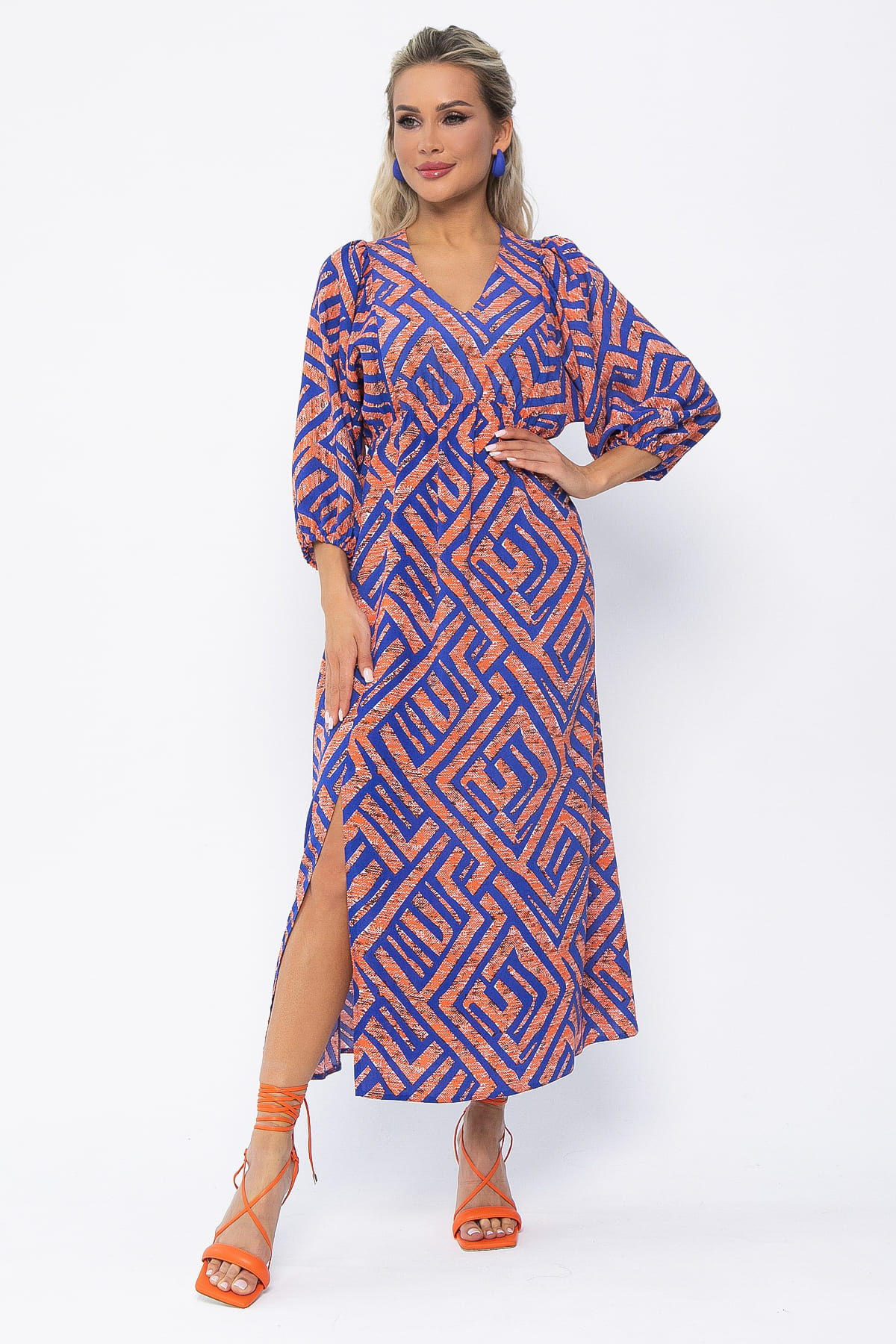 Лёгкое, воздушное, длинное летнее платье из штапеля — это то, что нужно для жаркой погоды! Оно не только удобное, но и красивое: яркий принт поднимет настроение и подчеркнёт вашу женственность. Оно отлично подходит для отдыха и прогулок, а также для города. Сочетайте его с разной обувью: туфлями, босоножками или кедами — и создавайте множество стильных образов! Платье имеет резинку по талии, рукав 3/4 на резинке и длинный разрез по ноге.