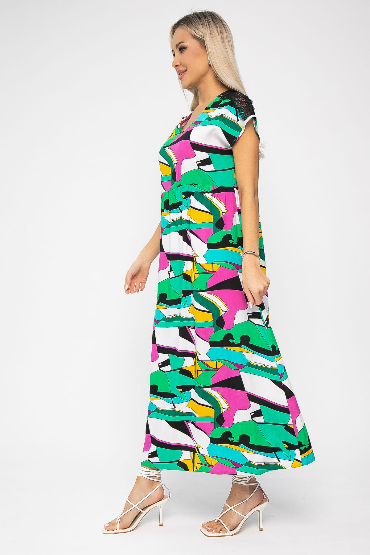Стильное летнее платье без рукава в зелёно-розовом цвете — идеальный выбор для теплых дней, сочетая комфорт и элегантность. Платье имеет завышенную отрезную талию, подчеркивающую фигуру. Один пышный ярус юбки на сборке добавляет объема и воздушности, создавая эффектный и женственный образ. V-образная горловина визуально удлиняет шею и придает платью утонченности. Изюминка платья — кружевной элемент в плечевой шов, добавляющий нотку романтики и изысканности.