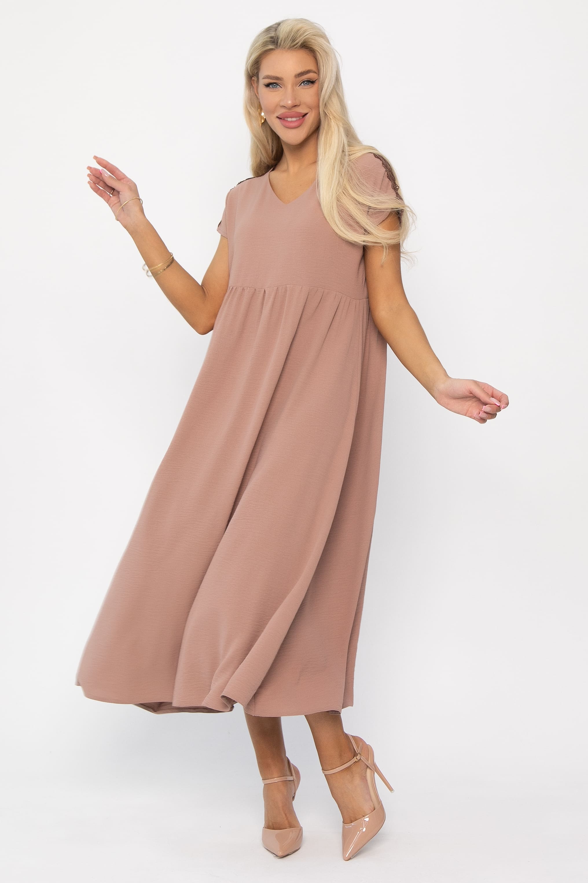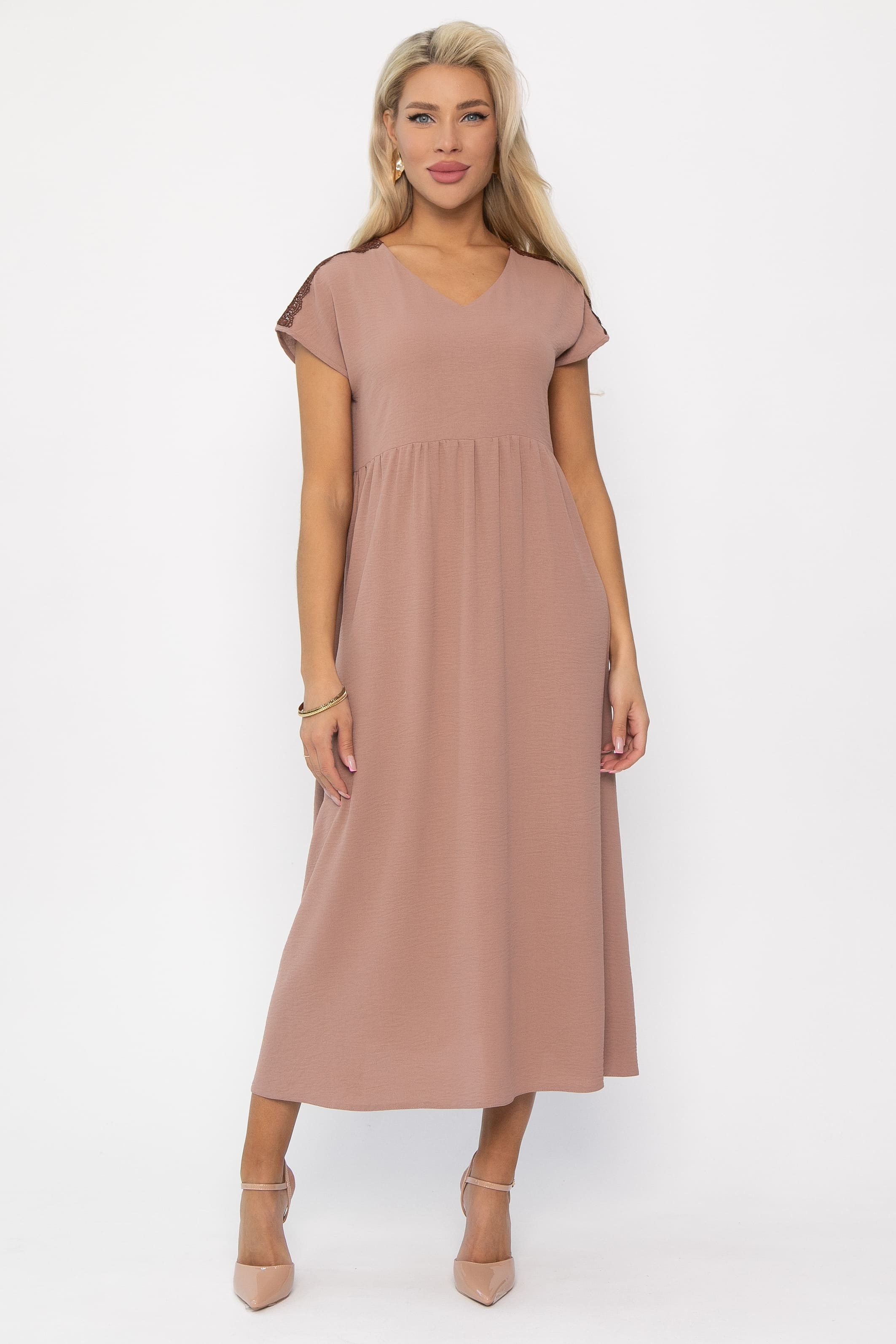 Стильное летнее платье без рукава — идеальный выбор для теплых дней, сочетая комфорт и элегантность. Платье имеет завышенную отрезную талию, подчеркивающую фигуру. Один пышный ярус юбки на сборке добавляет объема и воздушности, создавая эффектный и женственный образ. V-образная горловина визуально удлиняет шею и придает платью утонченности. Изюминка платья — кружевной элемент в плечевой шов, добавляющий нотку романтики и изысканности.