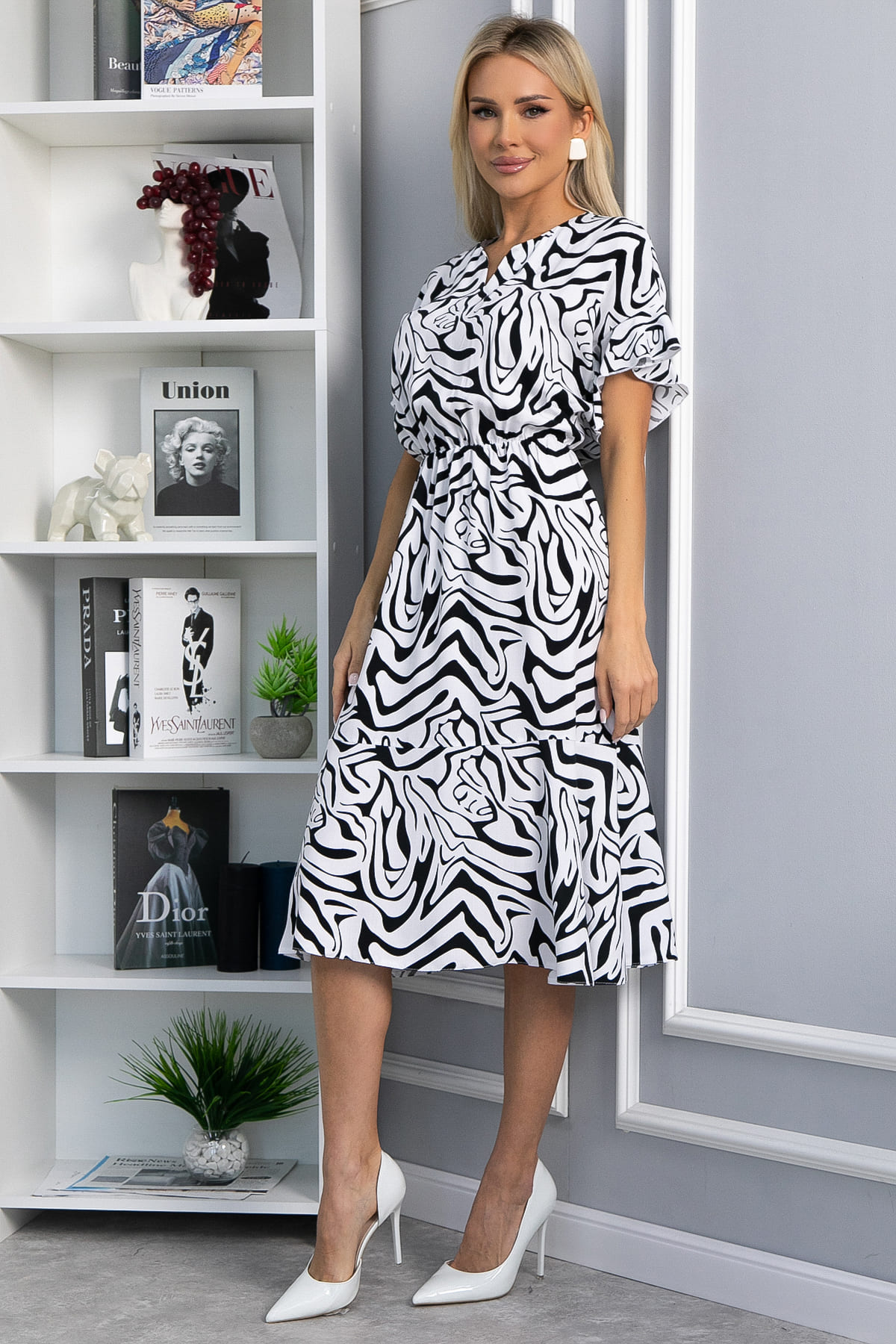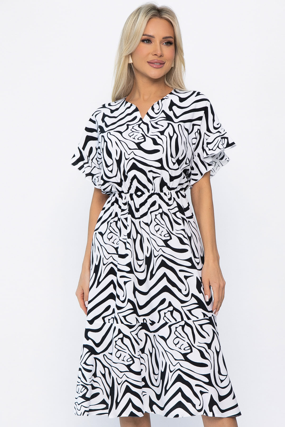 Великолепное платье в черно-белом цвете с оригинальными рукавами не оставит равнодушными никого! Модель имеет изысканный вырез на горловине, который придаёт ей особый шарм. Рукава и низ юбки выполнены в виде воланов, что придаёт образу воздушность и романтичность. Благодаря резинке, вшитой по линии талии, платье идеально садится по фигуре.