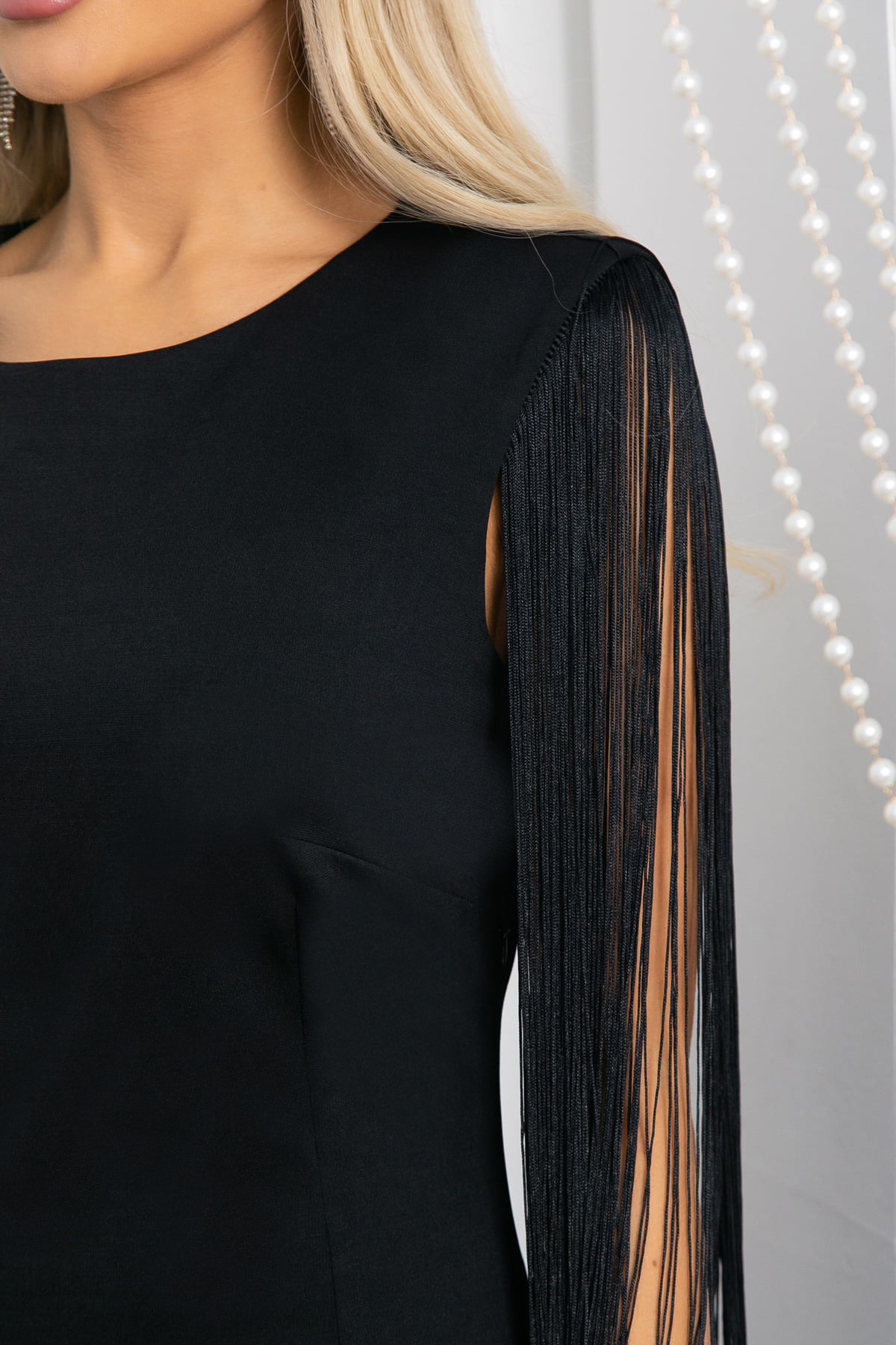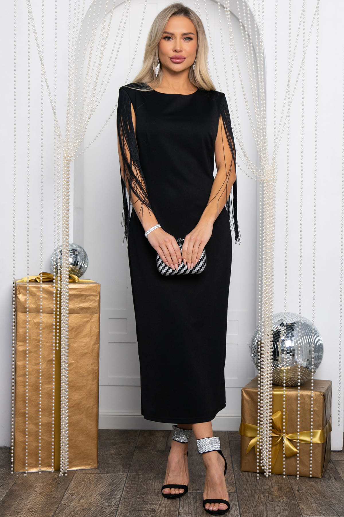 Женственное вечернее платье длиной миди — это символ утонченности и элегантности! Его особенность — изящная бахрома вместо рукавов, которая добавляет образу динамичности и особого шарма. Такое платье поможет создать завораживающий и изящный образ, который не оставит равнодушными окружающих и подчеркнет вашу неповторимую красоту.