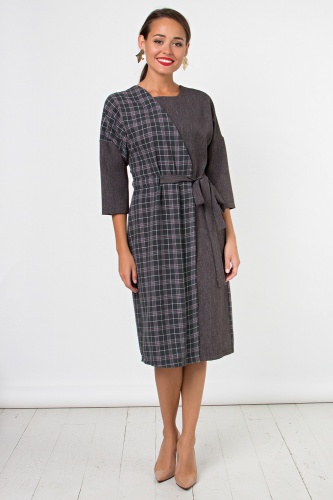 - Платье прямого покроя, отрезная деталь по переду выполнена из ткани в клетку и изумительно дополняет однотонную серую;