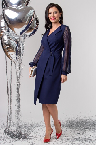 - Элегантное платье на запахе, с отложным воротничком и шикарными рукавами из сетки;