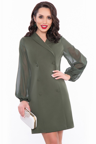 Платье, скроенное по типу двубортного пиджака. Оно имеет очень интересный фасон и помогает создать элегантный, изысканный и одновременно эффектный образ. Округлый вырез горловины, по переду застёгивается на пуговицы, обтянутые основной тканью. Рукав втачной, длинный, выполнен из шифона. Низ на резинке. Платье без замков, без подкладки.