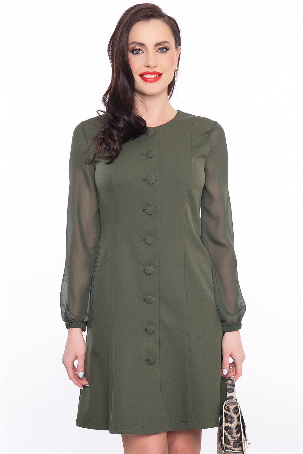 - Округлый вырез горловины, по переду застёгивается на пуговицы, обтянутые основной тканью;