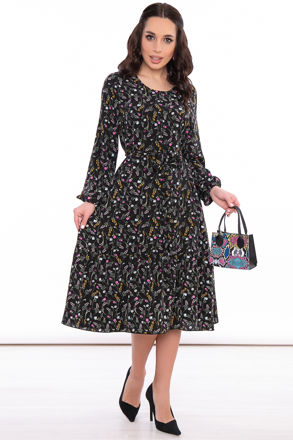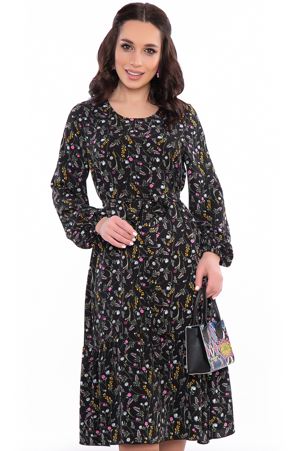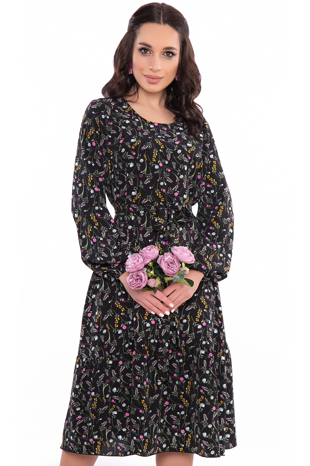 Изящное платье длины миди. Платье подчеркнет хрупкость женской фигуры, сгладит недостатки и зрительно улучшит пропорции. Изящное платье свободного кроя, округлый вырез горловины. Рукав втачной, длинный, низ на резинке. Шикарная, летящая юбка, по низу широкий волан. В комплекте пояс из основной ткани.
