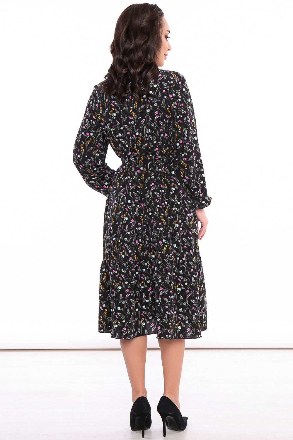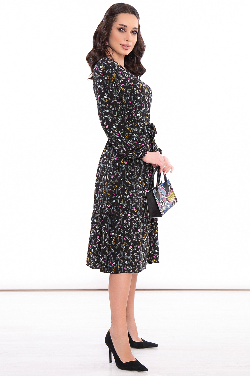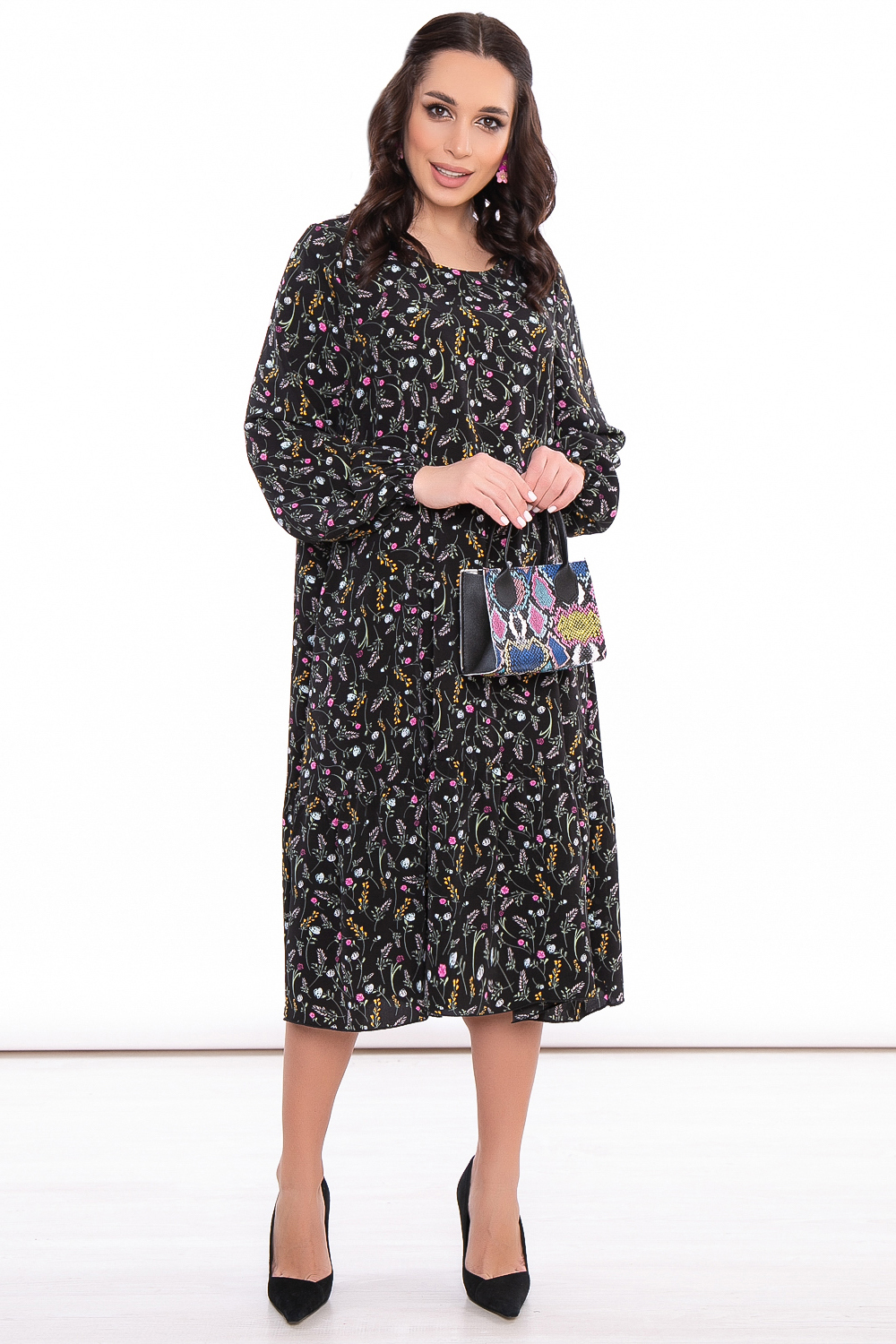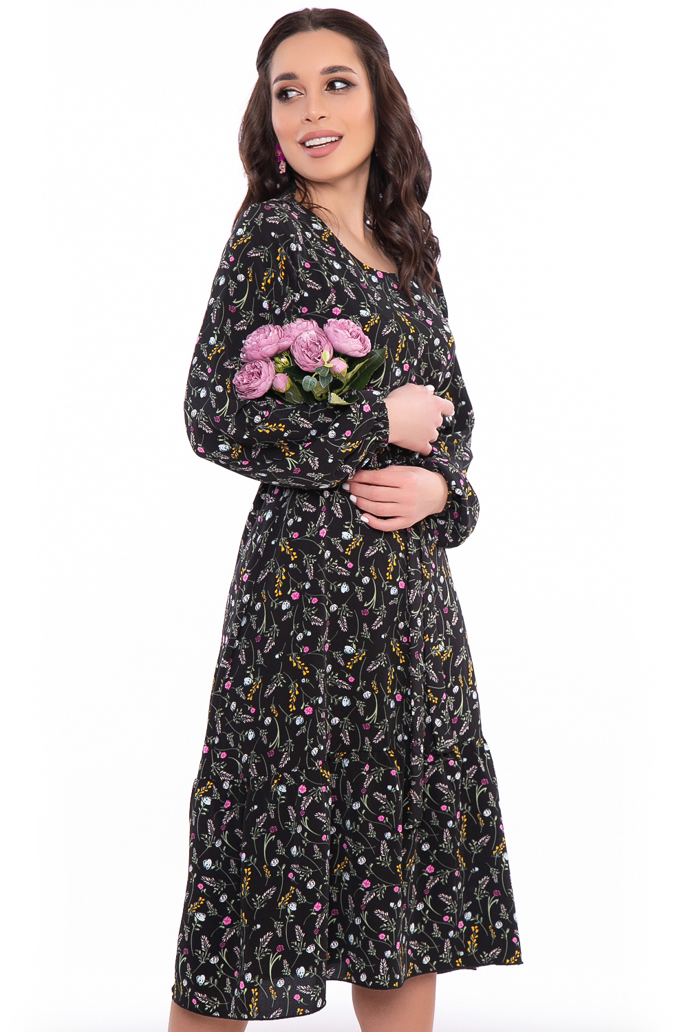 Изящное платье длины миди. Платье подчеркнет хрупкость женской фигуры, сгладит недостатки и зрительно улучшит пропорции. Изящное платье свободного кроя, округлый вырез горловины. Рукав втачной, длинный, низ на резинке. Шикарная, летящая юбка, по низу широкий волан. В комплекте пояс из основной ткани.