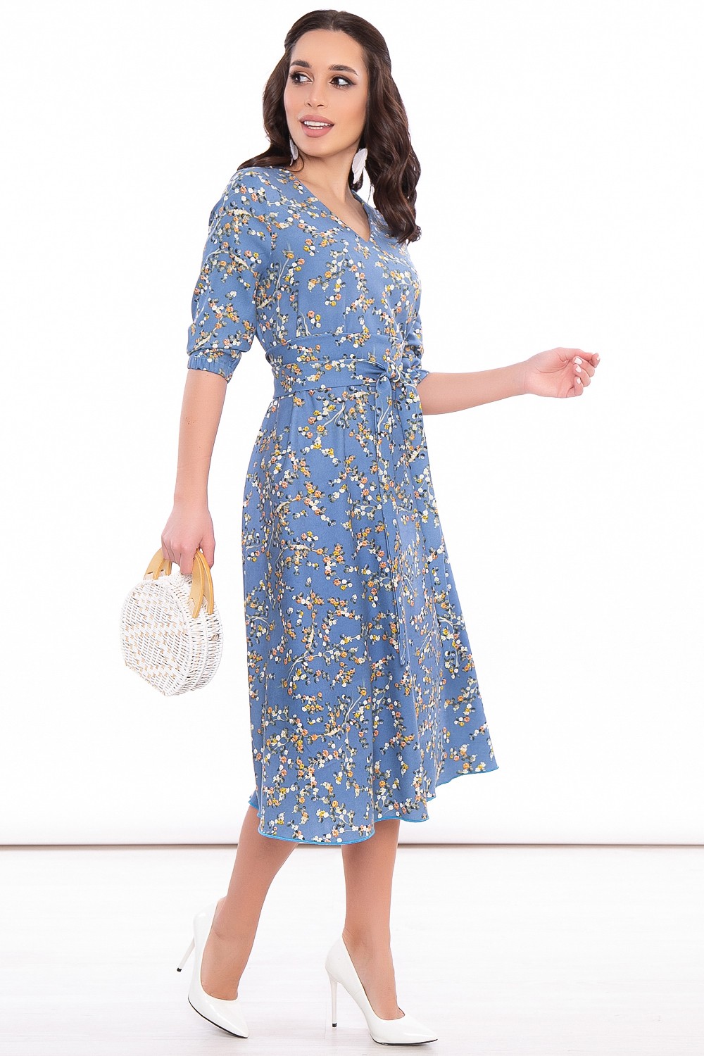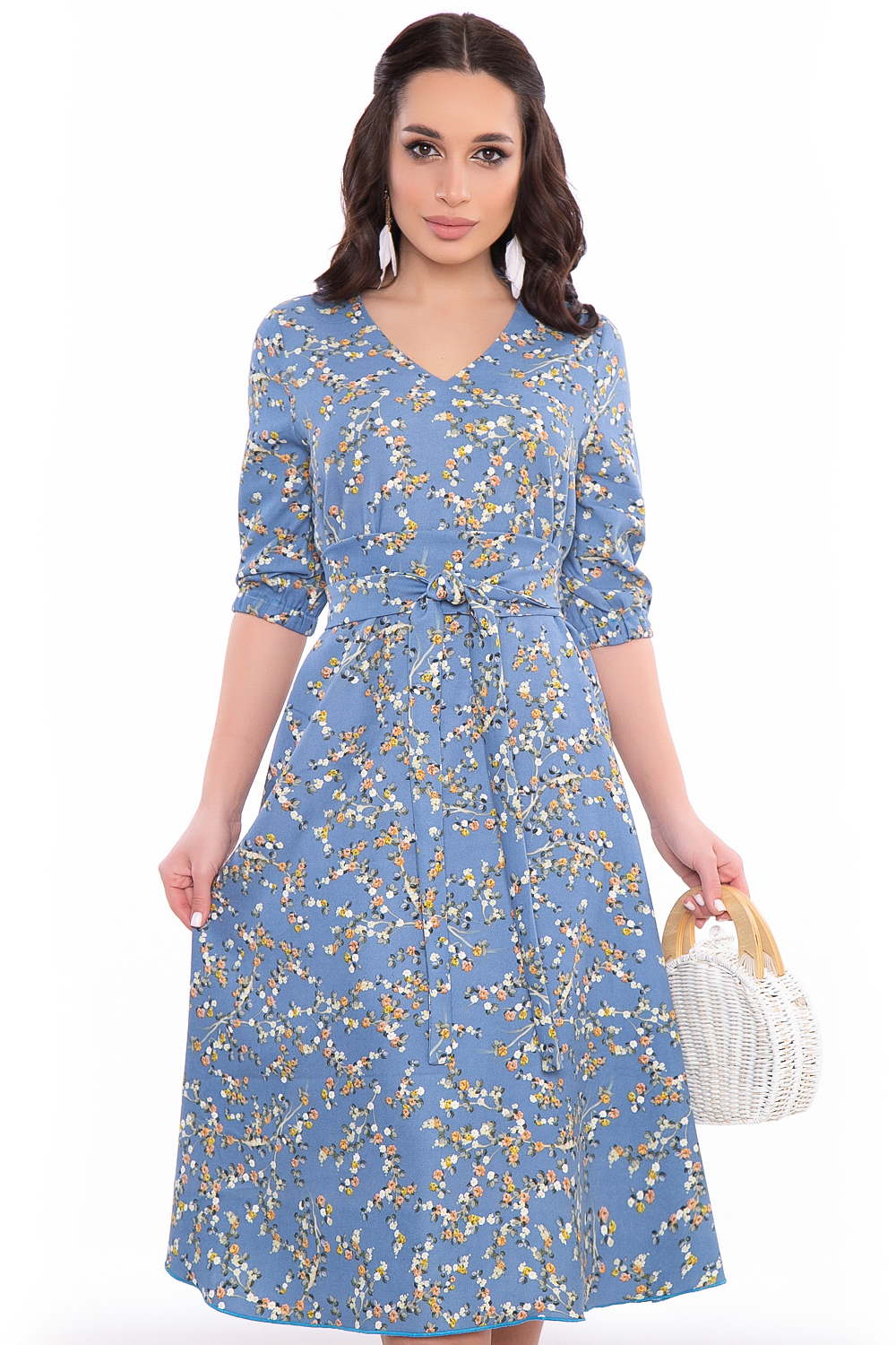 Весеннее платье длины миди подчеркнет хрупкость женской фигуры, сгладит недостатки и зрительно улучшит пропорции. Изящное платье свободного кроя, мягкий V-образный вырез горловины. Рукав втачной, укороченный, низ на резинке. В комплекте пояс-кушак из основной ткани.