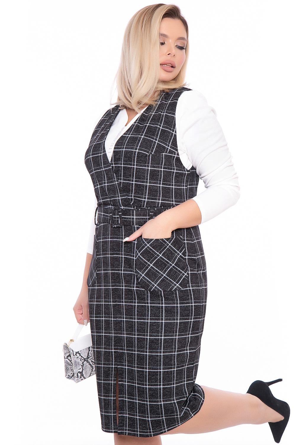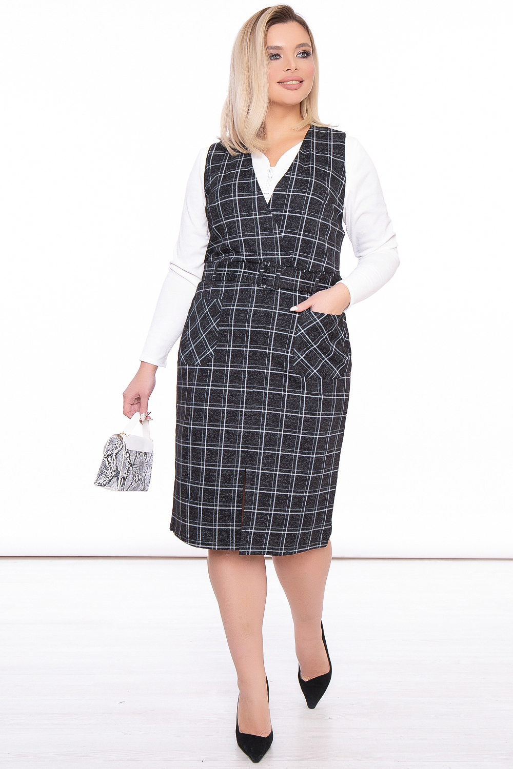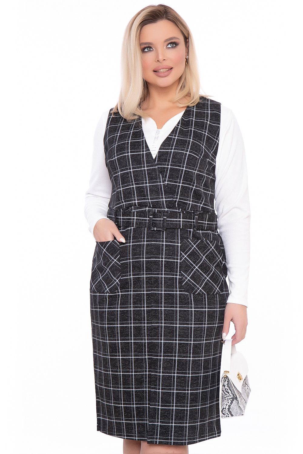 Базовый сарафан в клетку - идеальный вариант для деловой женщины. Верхняя часть сарафана отрезная, на запахе, нагрудные вытачки. Юбка разрезания по переду, с накладными карманами. В комплекте пояс с пряжкой, продевается в поясные шлевки.