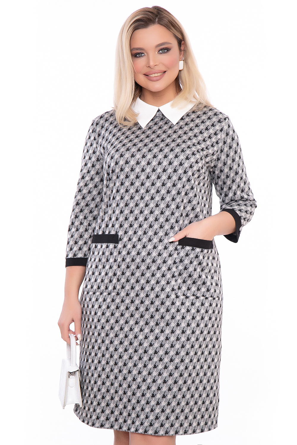 Женственное платье в офисном стиле с отложным воротничком. Рукав втачной, три четверти, на манжете. По переду накладные кармашки, сзади на юбке шлица. Платье без замков, без подкладки. Сзади застёгивается на застёжку "петля-пуговица".