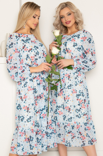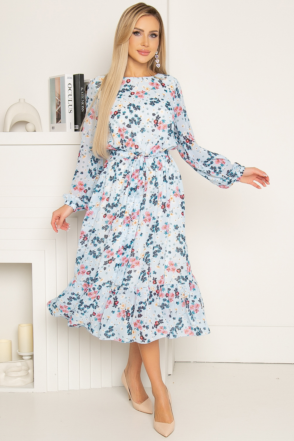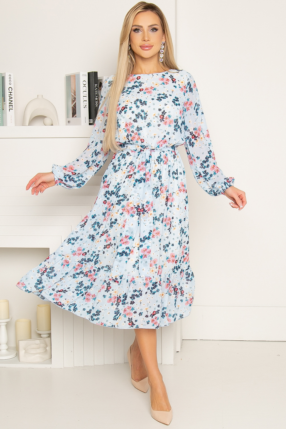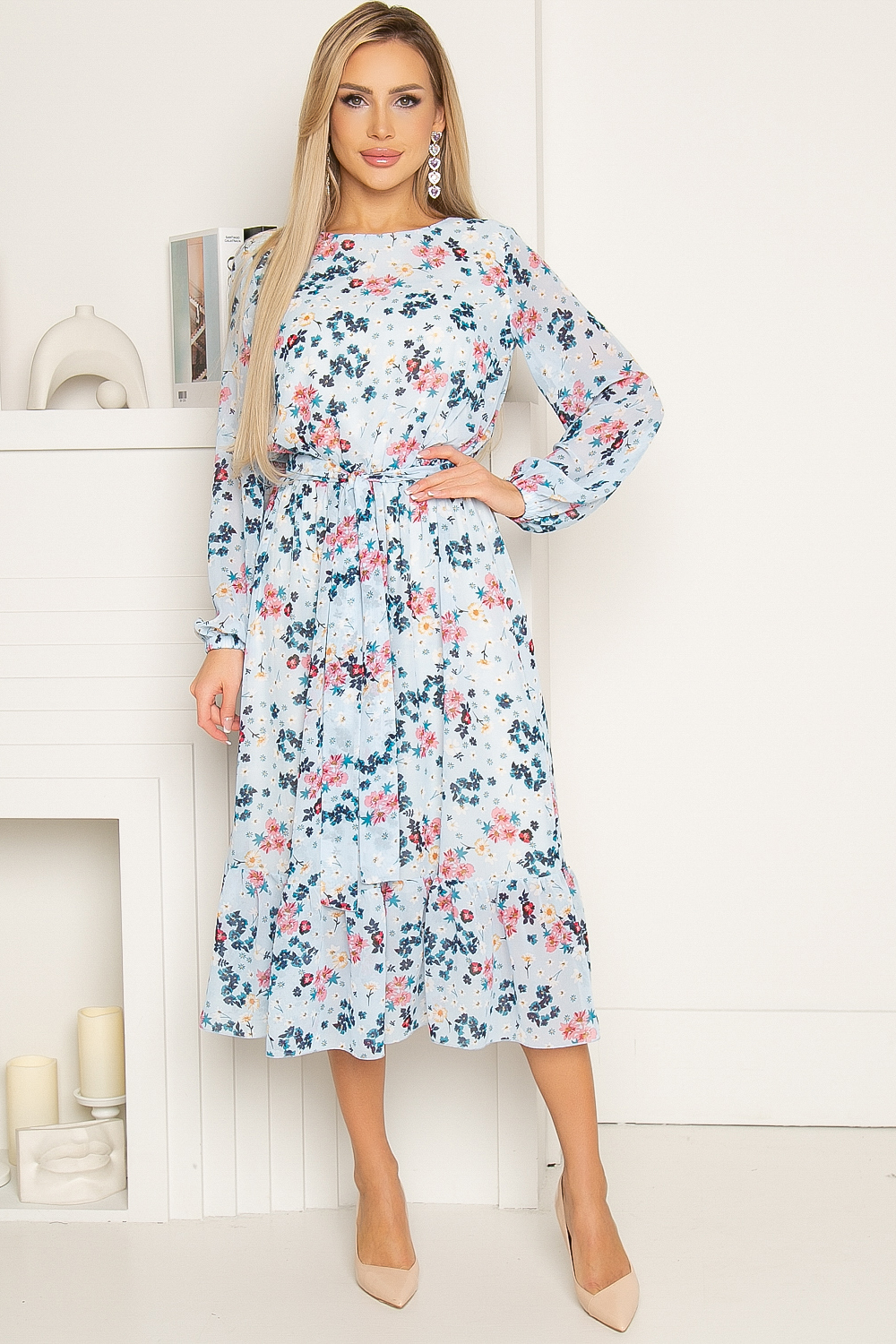 Платье из шифона в невероятном голубом оттенке! Самый женственный фасон платья с цветочным принтом не оставит никого равнодушным к Вашему образу. Платье А-силуэта, талия на резинке. По низу юбки - широкий волан, рукав втачной,длинный, низ на резинке. Горловина - мягкая лодочка. Платье на подкладке, без замков. В комплекте поясок из основной ткани.