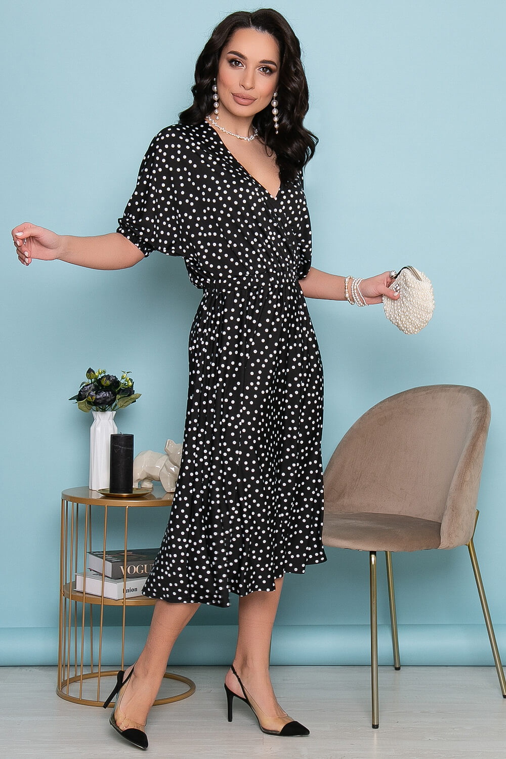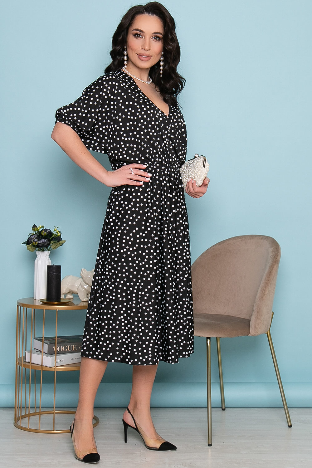 Невероятное платье, собравшее в себе все элементы женственного кроя: длина миди, струящаяся ткань, горошек... Всё это позволит создать неповторимый образ! Рукав цельнокроенный, короткий, низ на резинке. Пройма - "Летучая мышь". Талия на резинке.