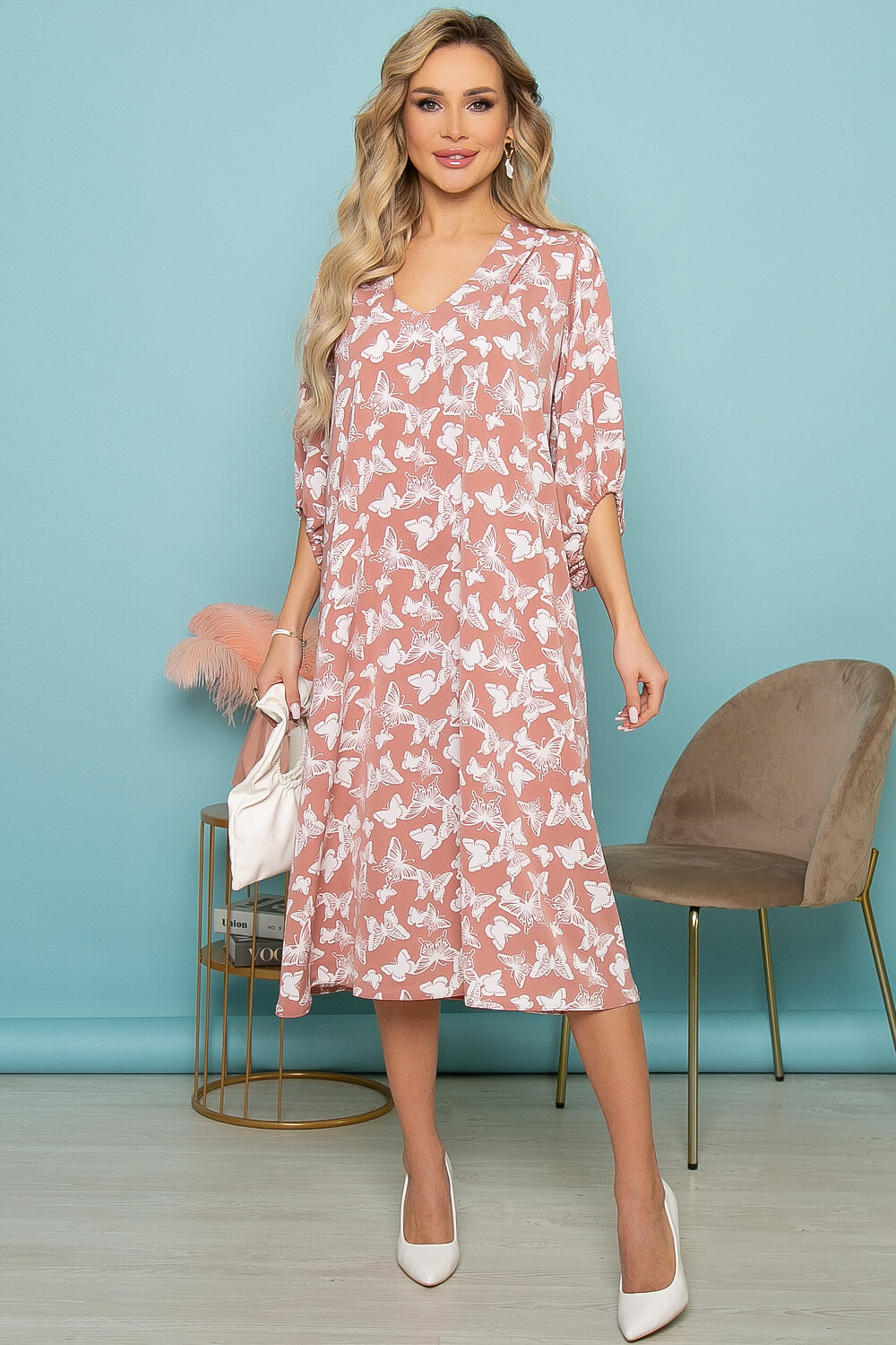 Платье из струящейся ткани - ХИТ продаж! Три метра ткани превратились в шикарное, летящее платье в базовом пудровом цвете с летним принтом - бабочки. Поверьте от Вас не смогут отвести восхищенных взглядов! Платье свободного силуэта. Мягкий V - образный вырез горловины. Интересного кроя рукав - втачной, три четверти, верх присборен, объемный, низ рукава асимметричный на резинке. По спинке отрезная кокетка и декоративные защипы. В комплекте широкий пояс, который можно завязать как кушак или на большой бант.