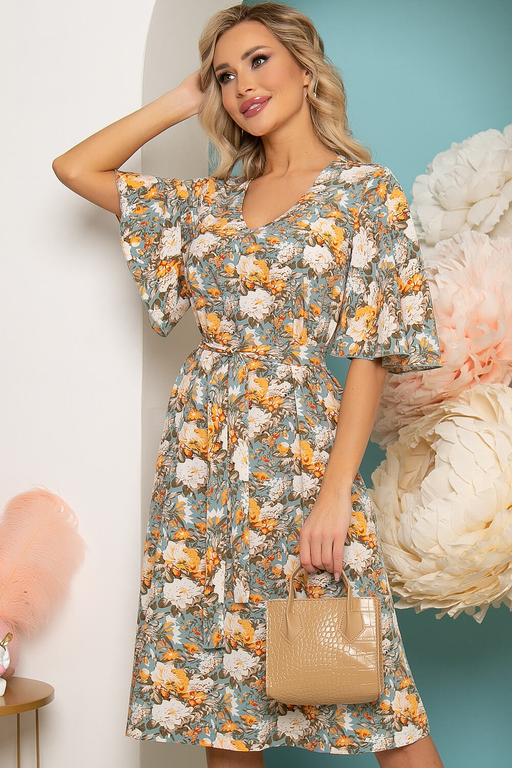 Платье свободного кроя с невероятно-нежным принтом и шелковистой текстурой! Изумительно смотрится как с каблучком, так и с босоножками! Женственный рукав-волан, V-образный вырез горловины. В комплекте пояс из основной ткани.