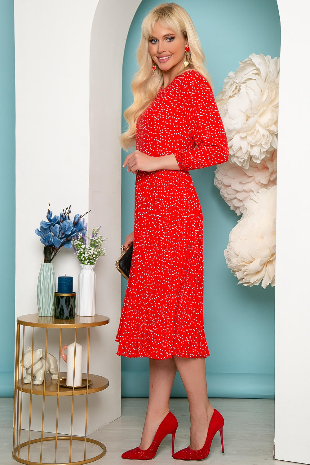 Долгожданный ХИТ продаж в новом исполнении! Летящее, манящее, женственное платье для самых утонченных натур. Плиссированная юбка длины миди,манящий красный цвет, принт в мелкий горошек - залог успешно созданного романтического образа. Талия отрезная, округлый вырез горловины. Рукав втачной, 7/8, низ на резинке. В комплекте поясок из основной ткани с пряжкой. Платье без подкладки, в боковом шве потайная молния.