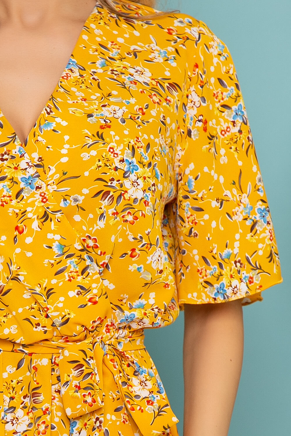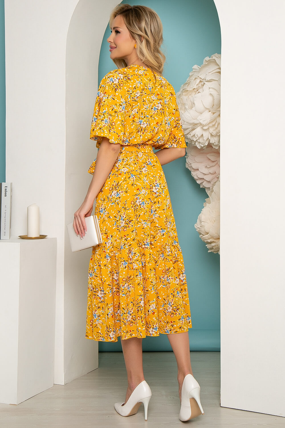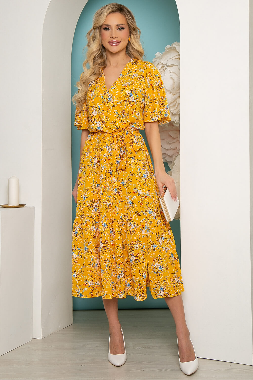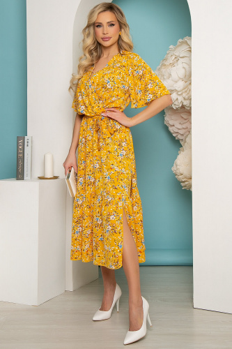 Женственное платье в красивом оттенке "Горчица". Верх платья скроен на запах, красивый летящий рукав. Талия на мягкой резинке, низ юбки украшает волан и разрез, деликатно приоткрывающий красоту Ваших ног. В комплекте пояс из основной ткани. Платье без подкладки.
