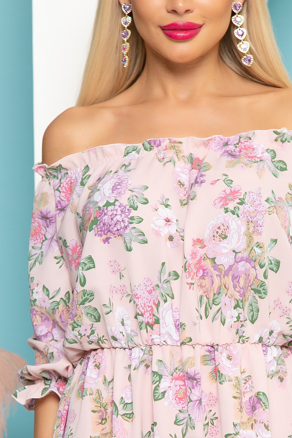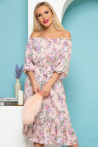 Как красиво! Такие платья освежают и создают лёгкий образ. Нежный и естественный рисунок на ткани порадует Вас и окружающих. Пышный рукав на резиночке и вырез горловины, который можно носить по-разному, спустив с обоих плеч, либо же игриво приоткрыв одно, придадут образу женственности. Платье средней длины, свободного кроя. Талия на резинке, низ платья украшает широкий волан. Платье без замков и подкладки. Пояс из основной ткани входит в комплект.