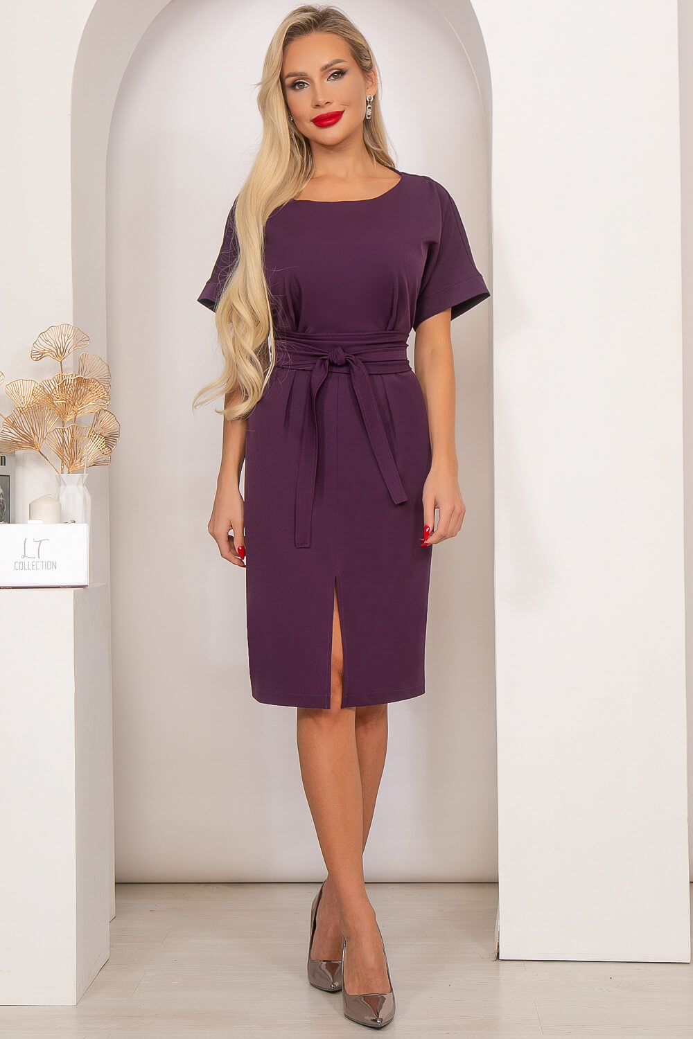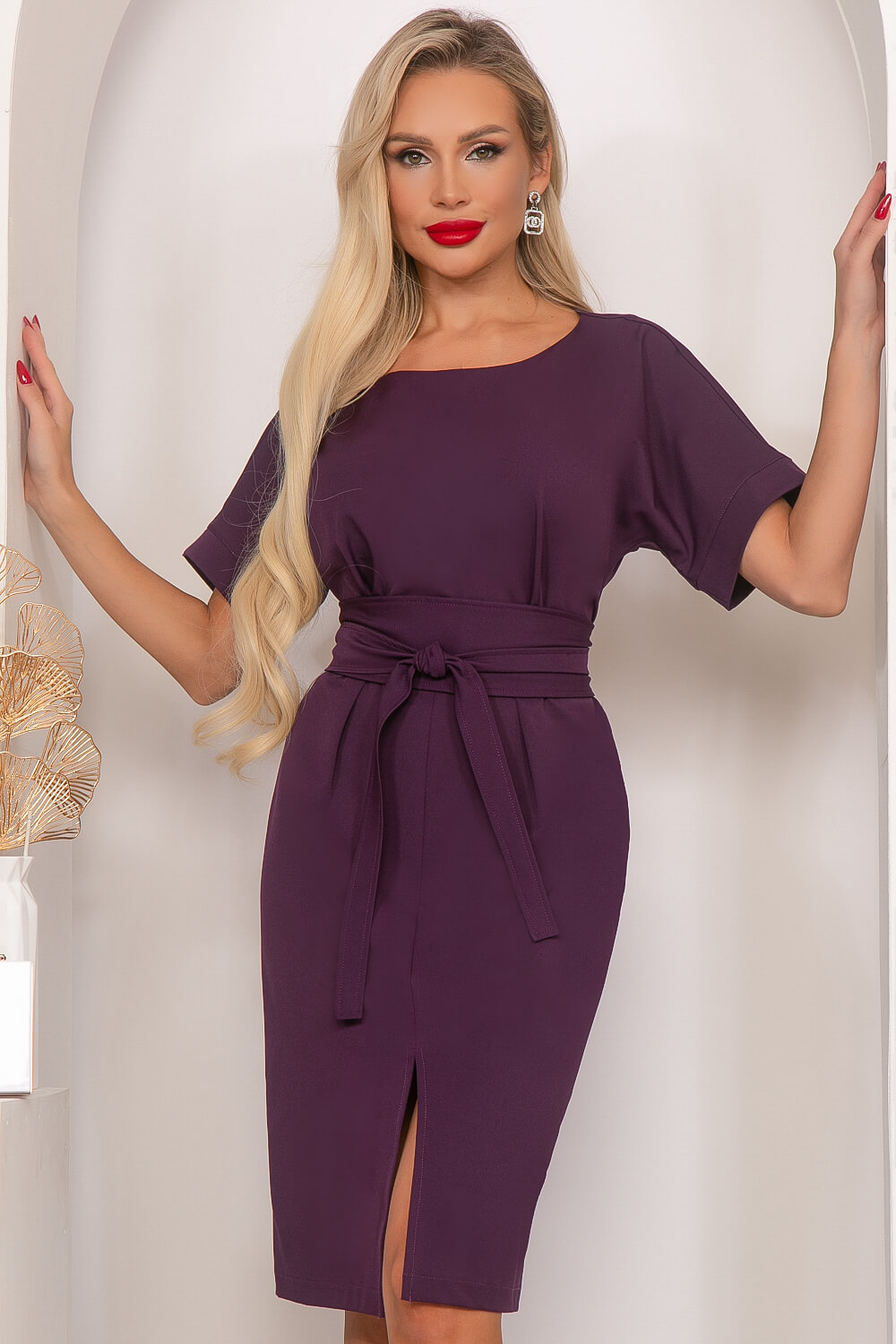 Элегантное платье в новом сливовом оттенке подчеркнёт Вашу женственность, а его интересный крой расставит грамотные акценты в образе. Платье полуприлегающего силуэта, по переду защипы в области груди и талии, юбка разрезная по переду с деликатным разрезом, приоткрывающим ножки. Рукав укороченный, с манжетом. В комплекте пояс-кушак, позволяющий красиво подчеркнуть талию.