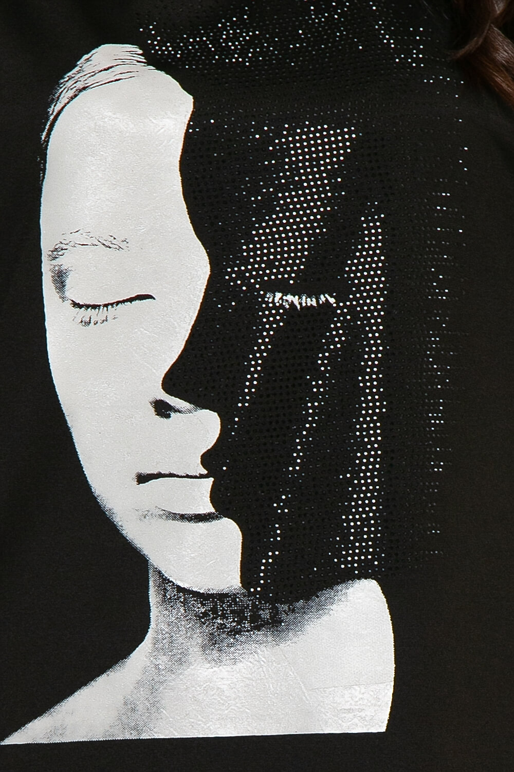 Платье-туника в стиле oversize подойдёт для создания комфортного повседневного образа. По передней части платья выполнена аппликация, благодаря которой эту модель можно использовать для создания вечернего образа. Платье свободного кроя, средней длины, линия плеча спущена.