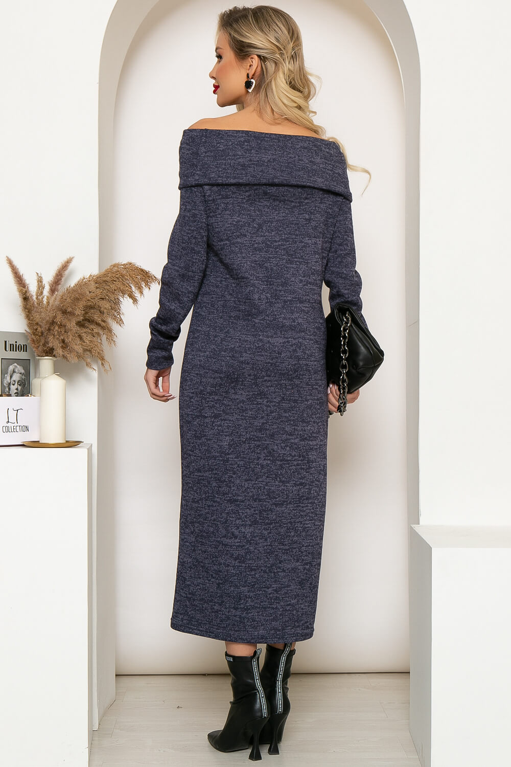 Теплое платье из уютного мягкого трикотажа "Меланж" с воротником-стойкой подарит тепло и комфорт в осенне-зимний период. Воротник можно укладывать двумя разными способами: свободно вокруг горловины, как хомут или спустить на плечи, приоткрыв их. В сочетании с длиной миди, платье, спущенное на плечи, будет выглядеть стильно и интригующе. Длинные втачные рукава оснащены манжетами.