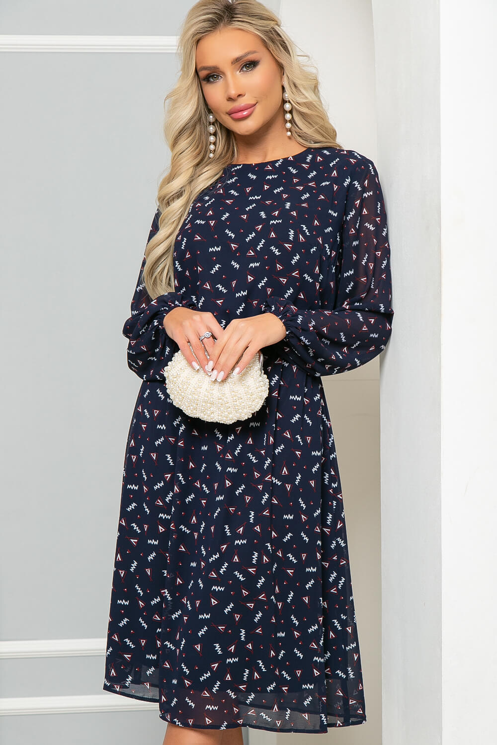 Шифоновое платье в базовом синем оттенке подойдёт в качестве красивого образа на каждый день. Свободный крой позволит чувствовать себя комфортно и при этом выглядеть очень женственно. По талии собрано на мягкую резинку, подчёркивающую линию талии. Гармоничная длина платья позволяет сочетать его с разнообразными вариантами обуви от туфель-лодочек до сапог с высоким голенищем. Принт на ткани побуждает экспериментировать. Отличный шанс разнообразить гардероб!