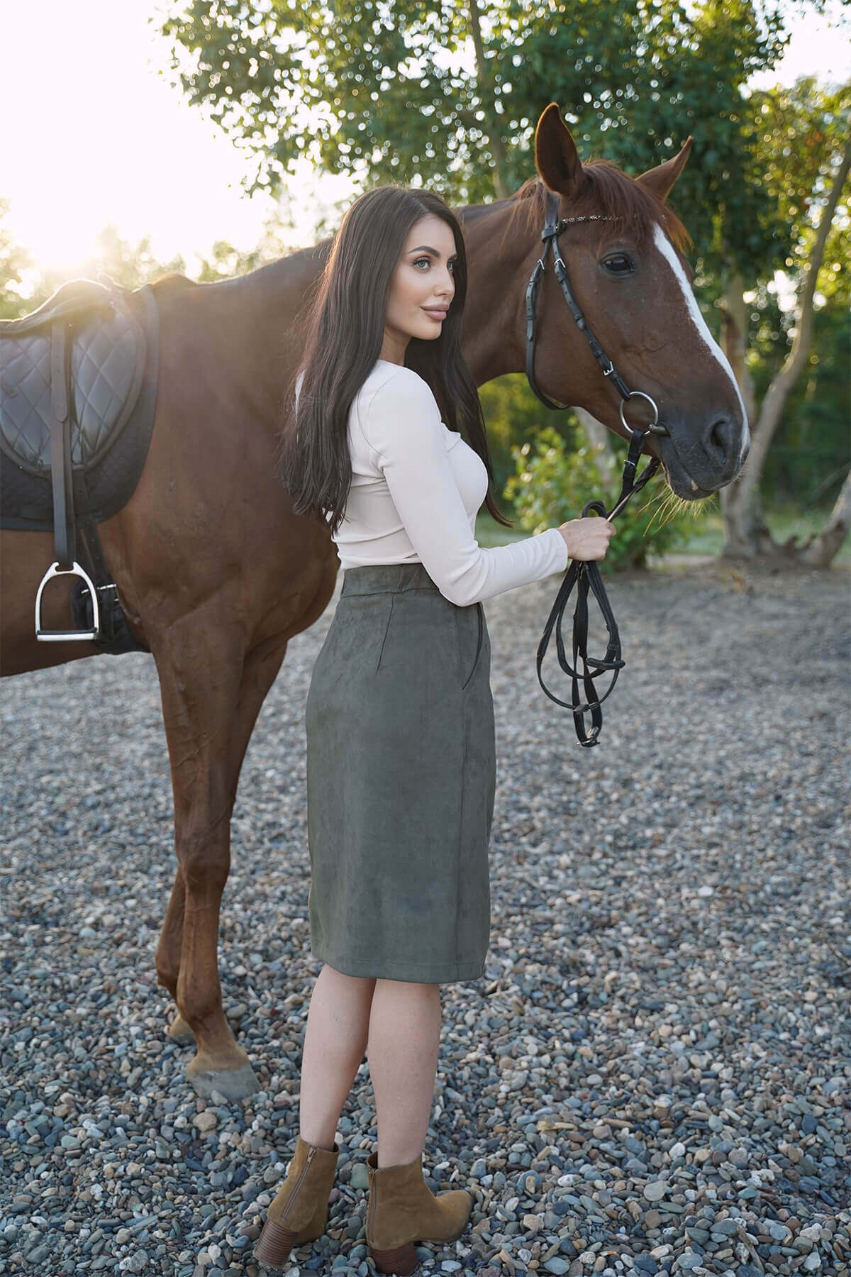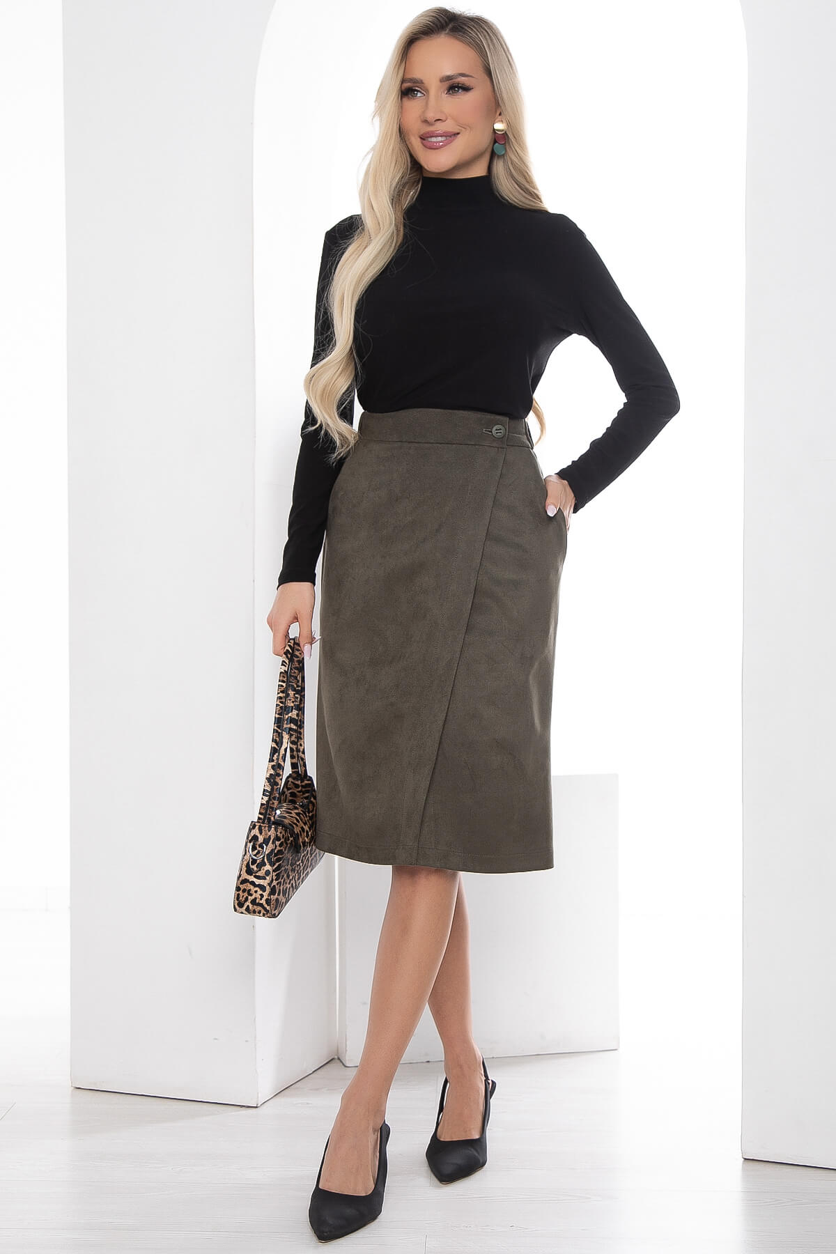 Эффектная замшевая юбка в оттенке хаки прямого кроя. Прекрасный офисный вариант или для деловой встречи. Замшевые изделия подчеркивают безупречный вкус и тонкое ощущение стиля своей обладательницы. Элегантный запах деликатно открывает красоту ног.