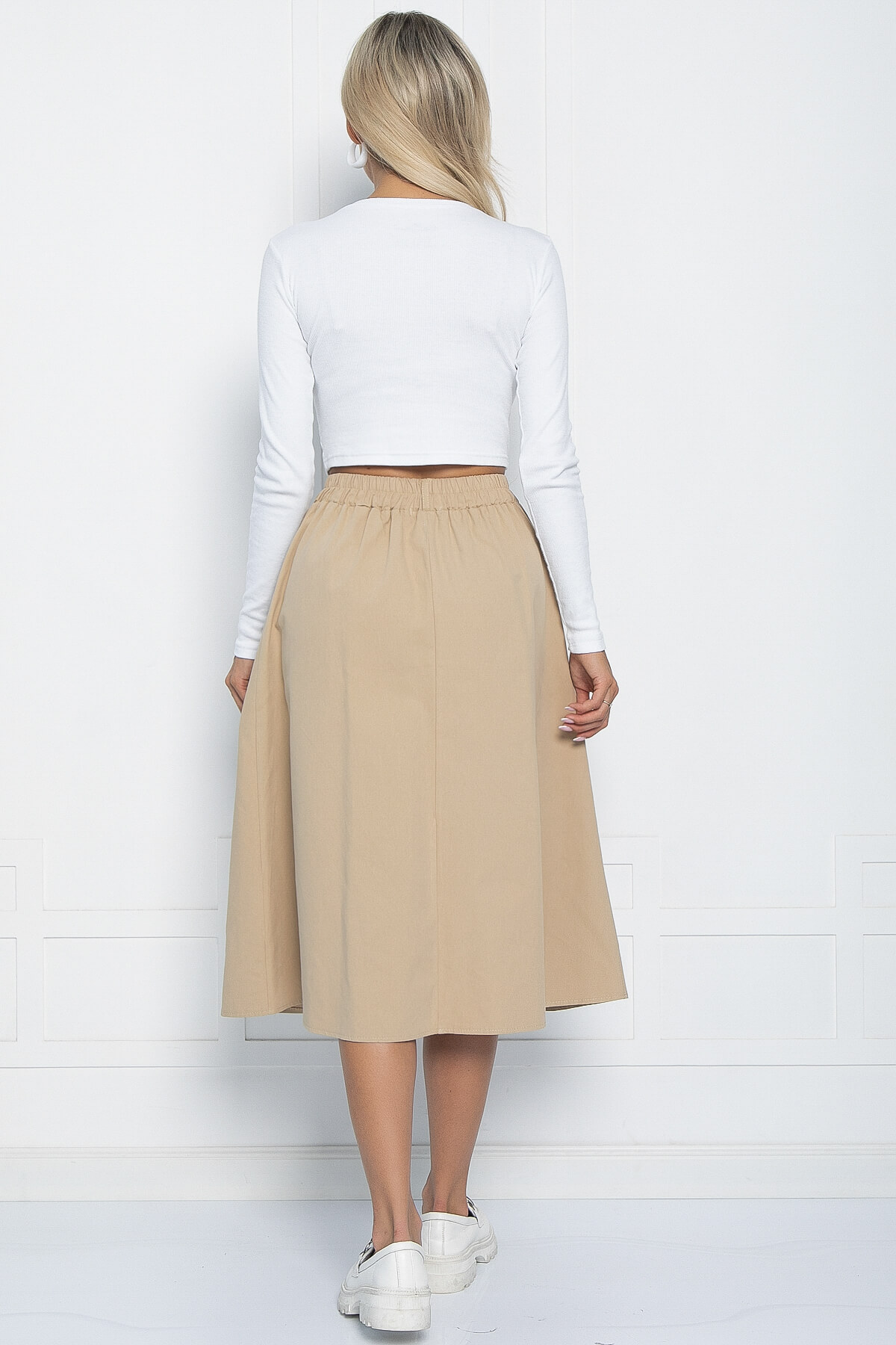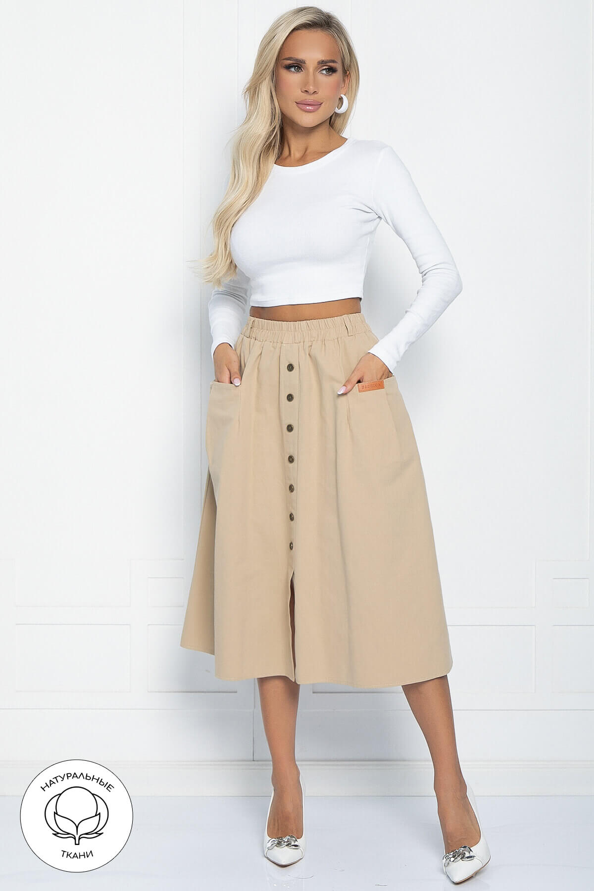 Юбка выполнена из натуральной ткани, которая обеспечивает комфорт и уверенность на протяжении всего дня. Её особенностью являются декоративные пуговицы на передней части. Юбка с объёмными карманами на защипах подойдёт как для офиса, так и для повседневного образа. Она прекрасно сочетается как с классической рубашкой, блузками, топами и футболками.