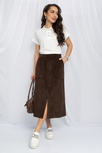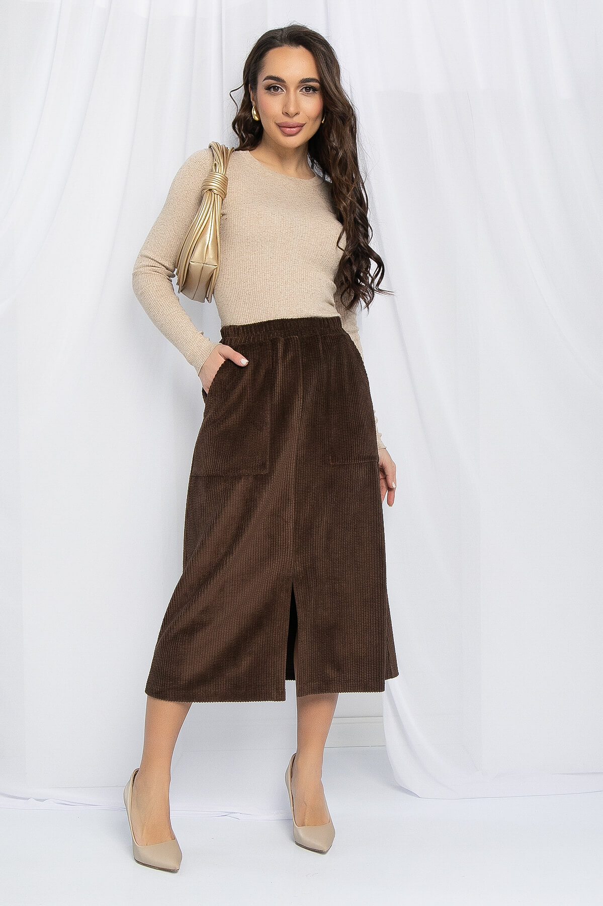 Юбка из крупного вельвета с разрезом спереди — это то, что нужно для весеннего гардероба. Она станет универсальным элементом вашего образа, который можно носить как в офис, так и на прогулку. Эта юбка длиной миди выполнена из вельвета коричневого цвета. Она имеет пояс на резинке, что обеспечивает комфортную посадку. А накладные карманы добавляют практичности и делают образ более стильным. Юбку можно сочетать с различными вещами: блузами, свитерами или жакетами. Это позволит создавать разнообразные образы — от строгих до романтичных.