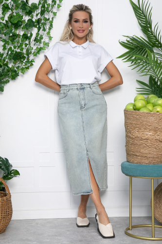Юбка классического кроя выполнена из джинсового материала с добавлением стрейча, что обеспечивает отличное прилегание и комфорт в носке. Юбка имеет изящный разрез по переднему полотнищу, который добавляет нотку элегантности и позволяет свободно двигаться. Функциональные боковые и задние карманы делают модель практичной и удобной, а шлёвки позволяют носить юбку с поясом для дополнительного акцента на талии. Приталенный крой подчеркивает фигуру и создает гармоничный силуэт. Станет универсальным элементом вашего гардероба, который легко сочетать с различными топами и обувью. Имеет хорошее растяжение.