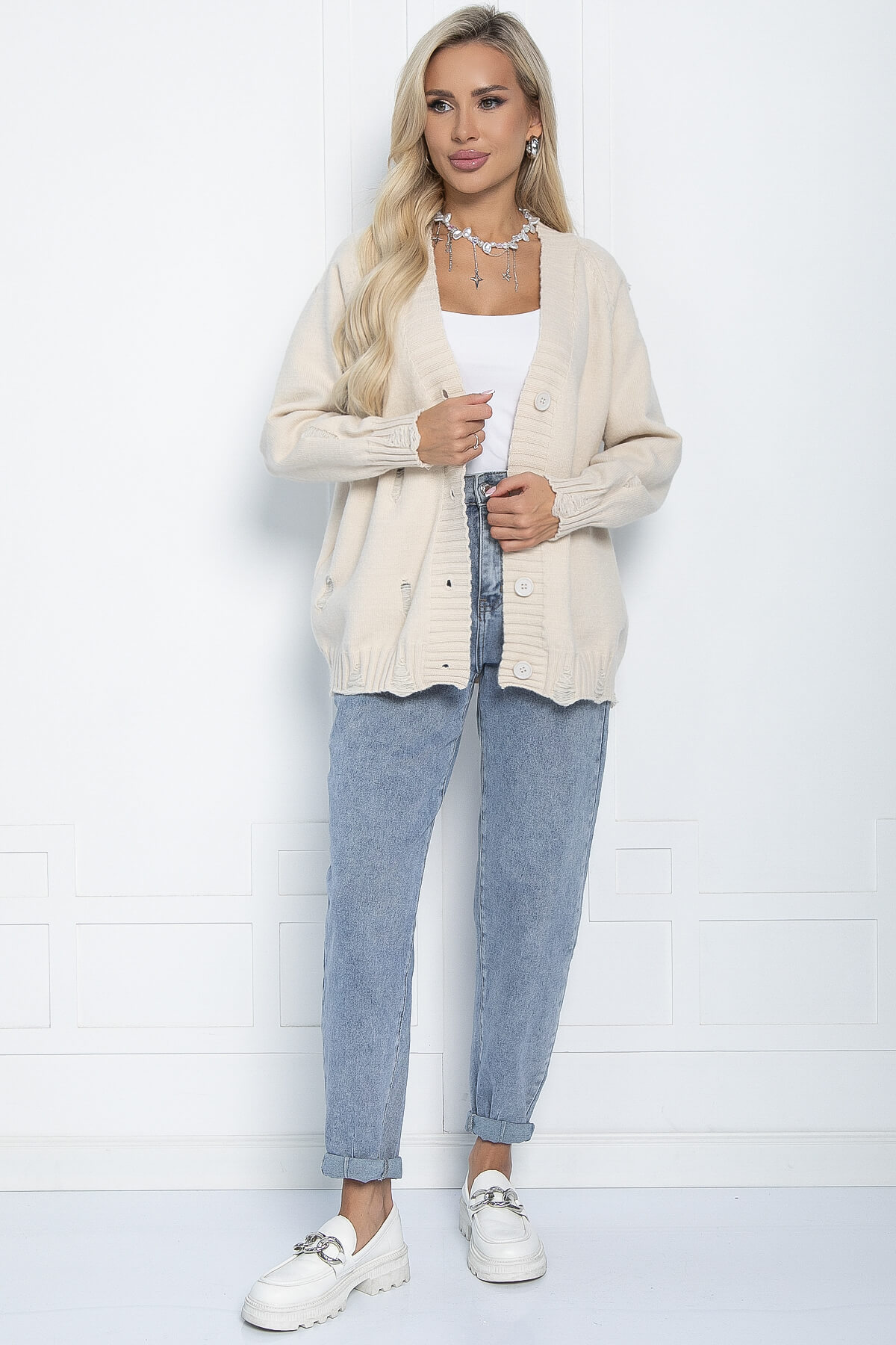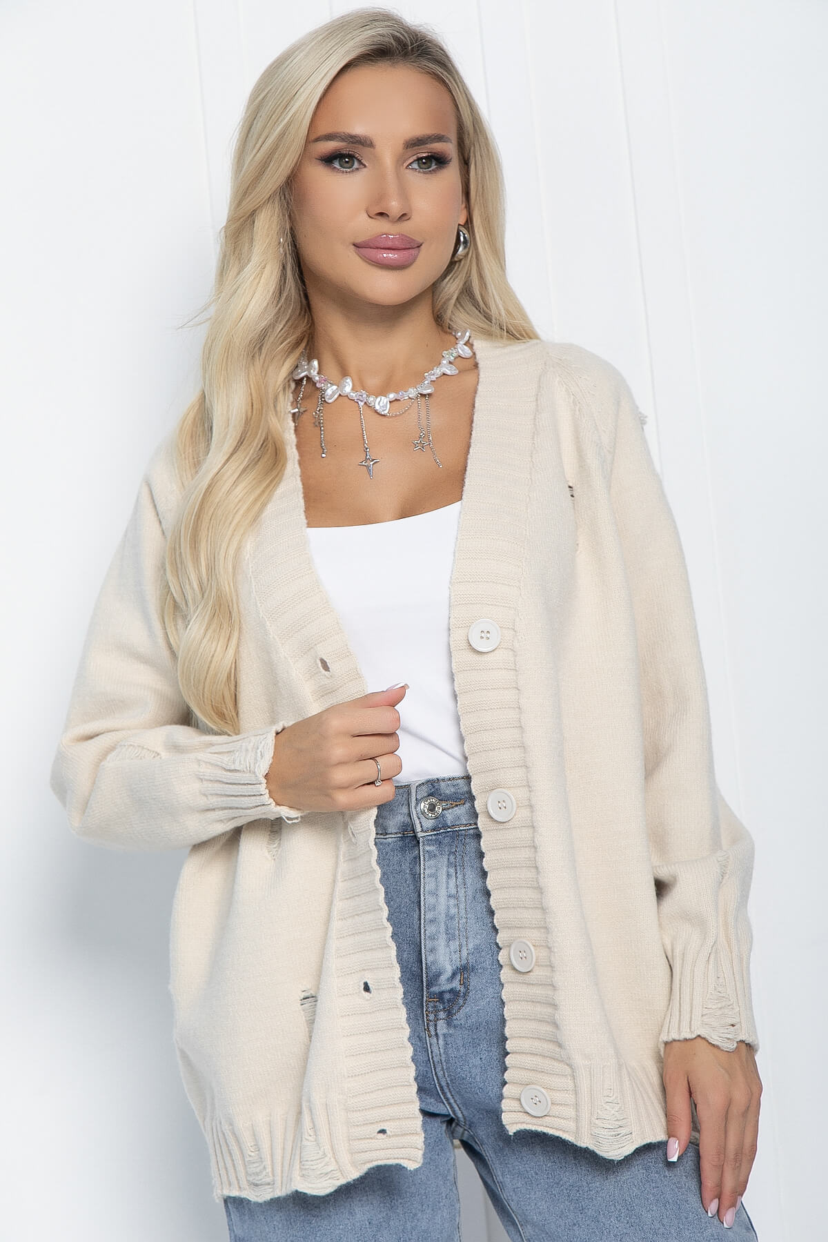 Кардиган на пуговицах с рваными элементами — это универсальный предмет гардероба, который можно носить в самых разных ситуациях: в школе, в офисе, на деловой встрече или празднике. Его однотонный оттенок позволяет легко сочетать с другими вещами. А благодаря оверсайз силуэту он будет удобен для беременных и будущих мам.