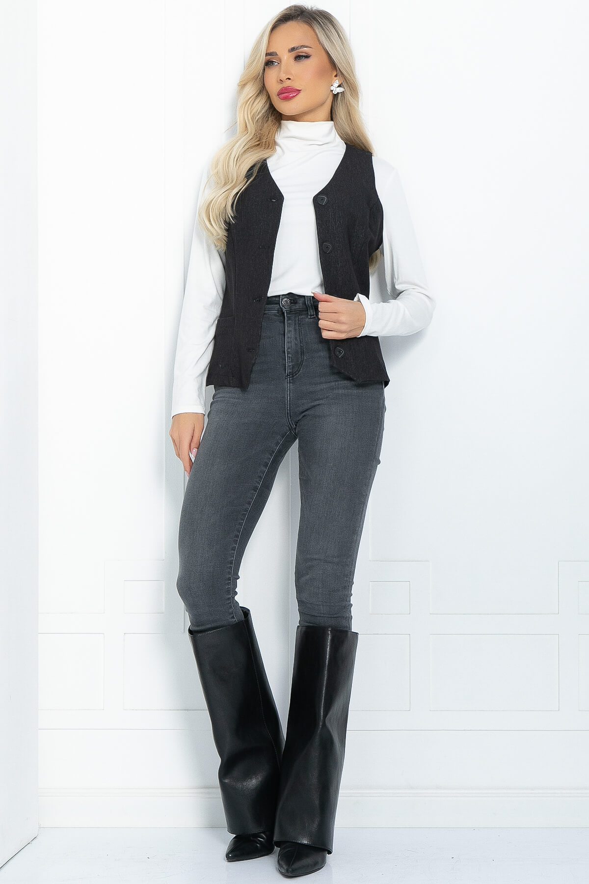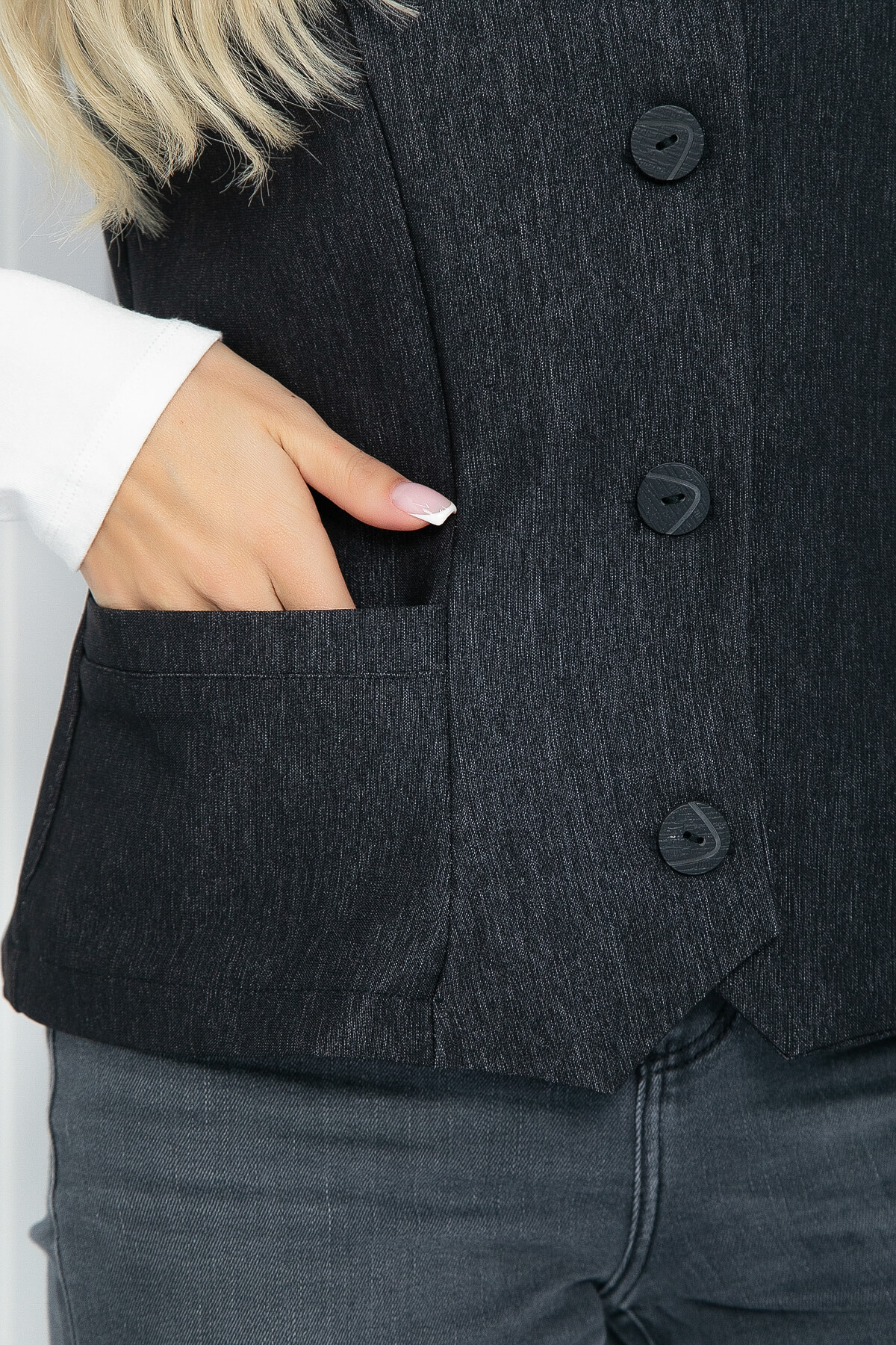 Жилет из костюмной ткани насыщенного серого цвета с рельефными выточками. Выполнен в классическом стиле, имеет V-образный вырез и небольшие карманы. Низ полочки выполнен уголком, за счет чего несколько длиннее спинки. Такой жилет можно использовать в качестве второго слоя – на рубашку или базовую футболку.