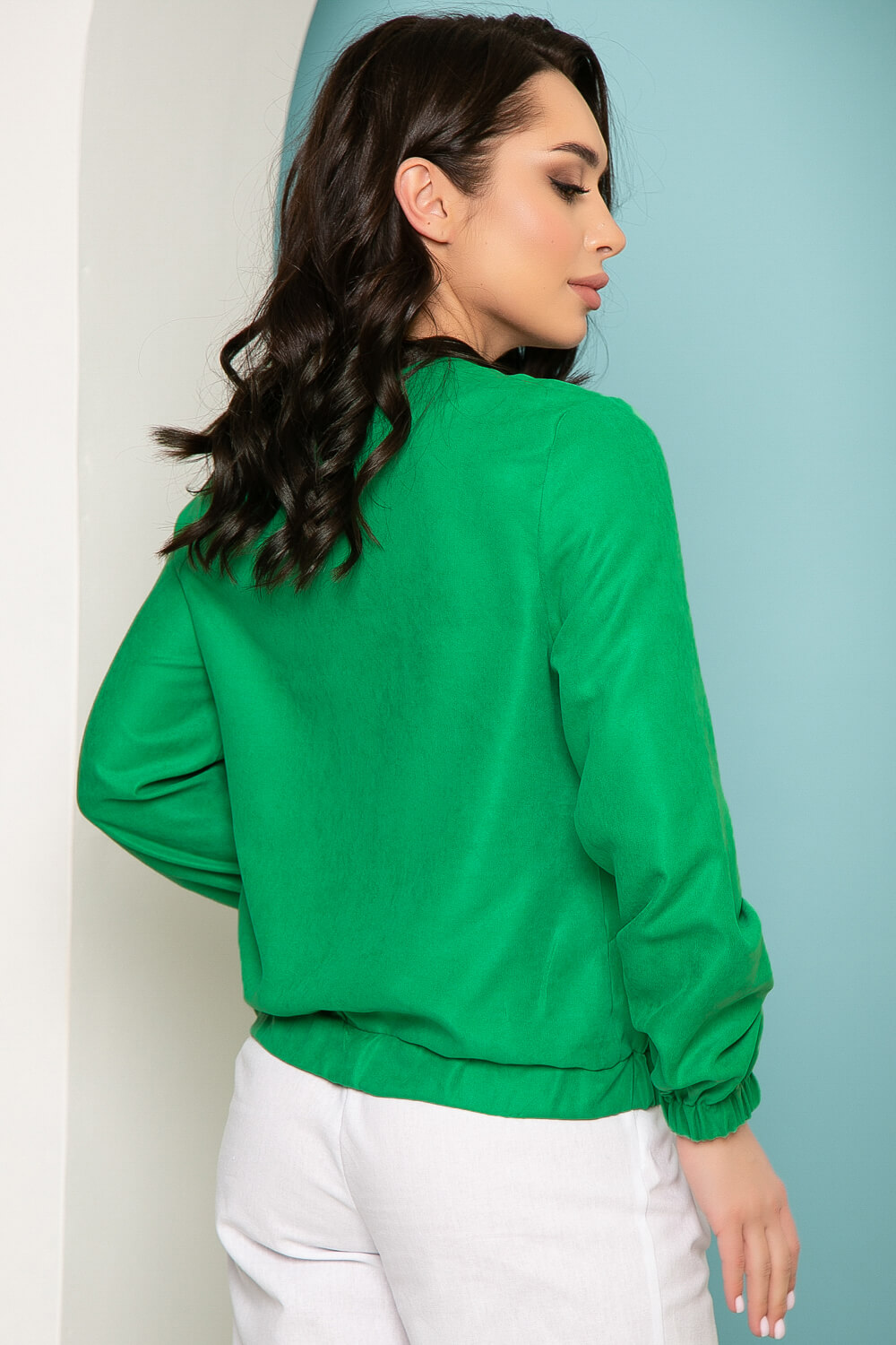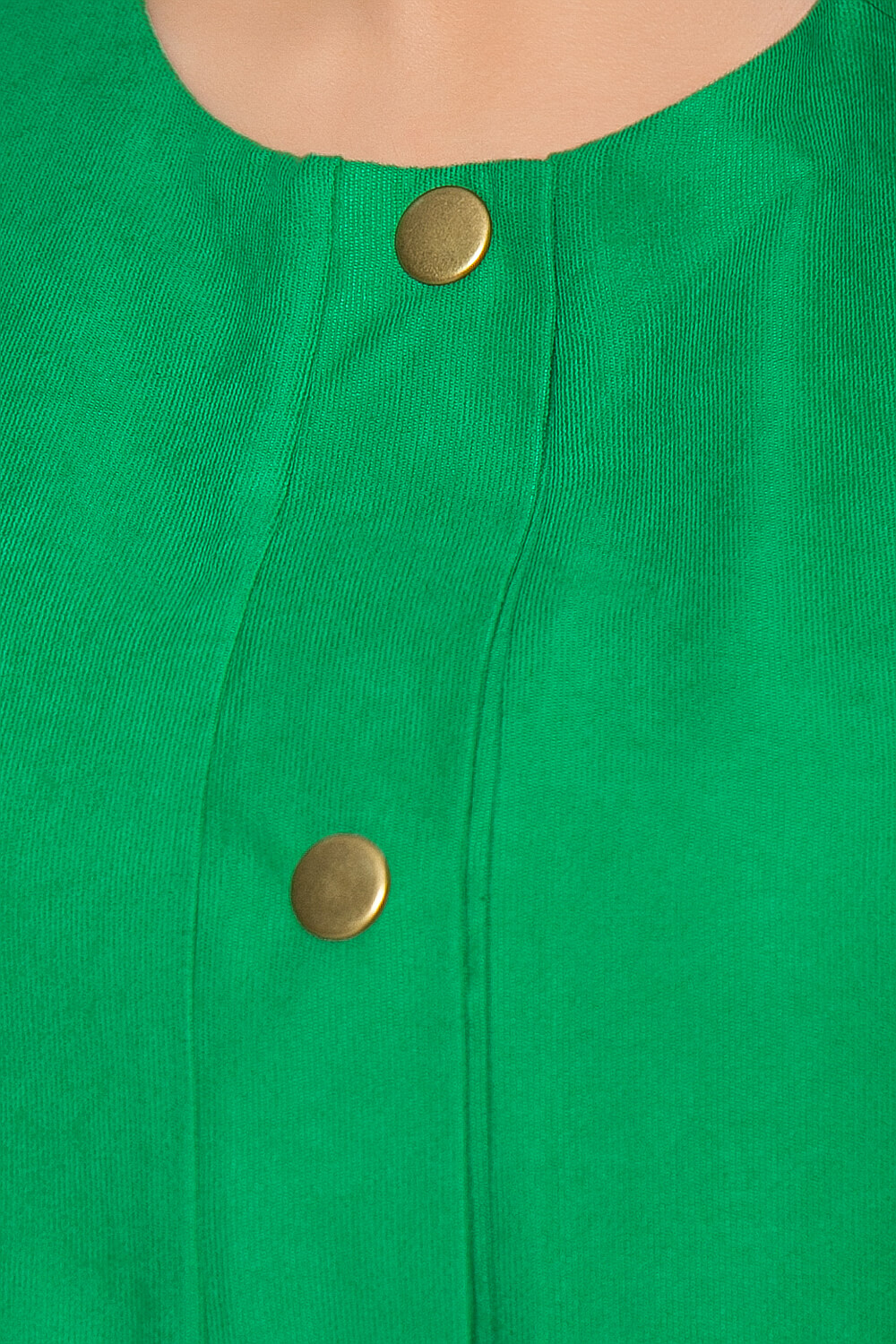 Бомбер из облегчённого микро-вельвета красивого зелёного цвета окутает Вас своей нежностью и сделает образ ярче и привлекательнее. Рукав втачной, длинный, на резинке. По низу бомбера - притачной пояс на резинке. Застёгивается на кнопки. Бомбер без подкладки.